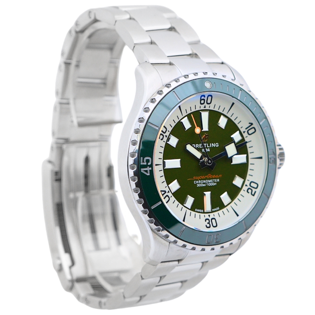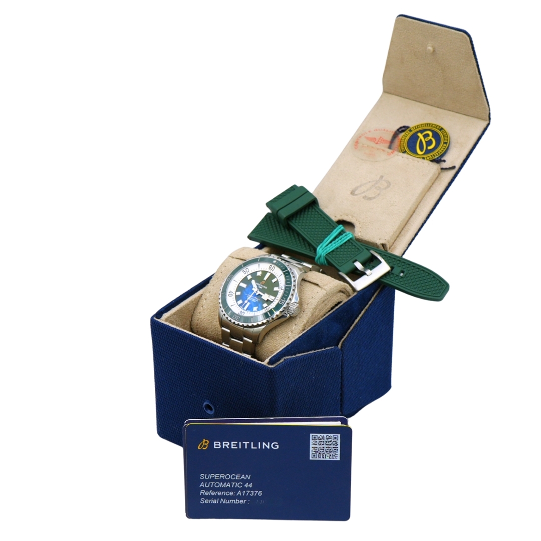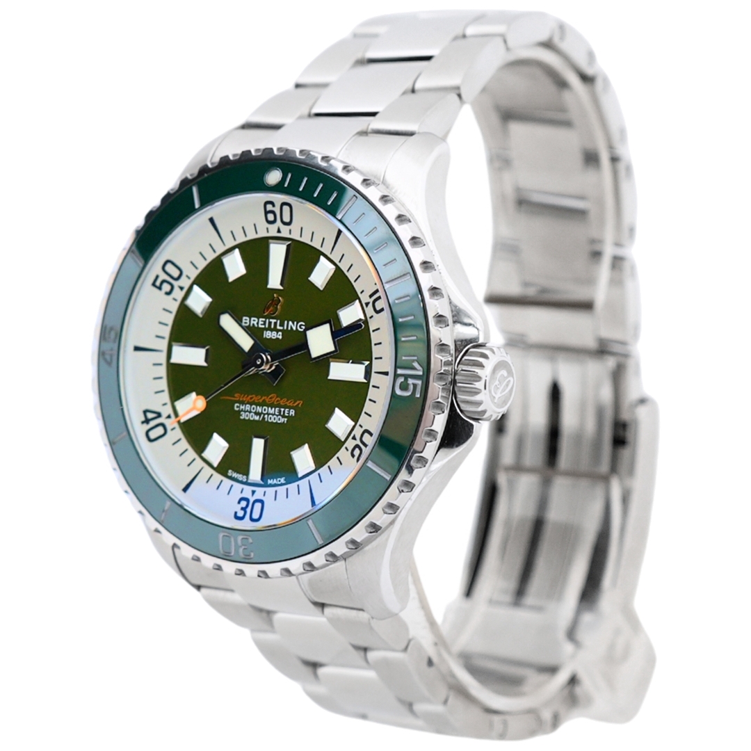 A Breitling Superocean 44 Watch, Stainless Steel with a Green Bezel on a Green & White Dial.