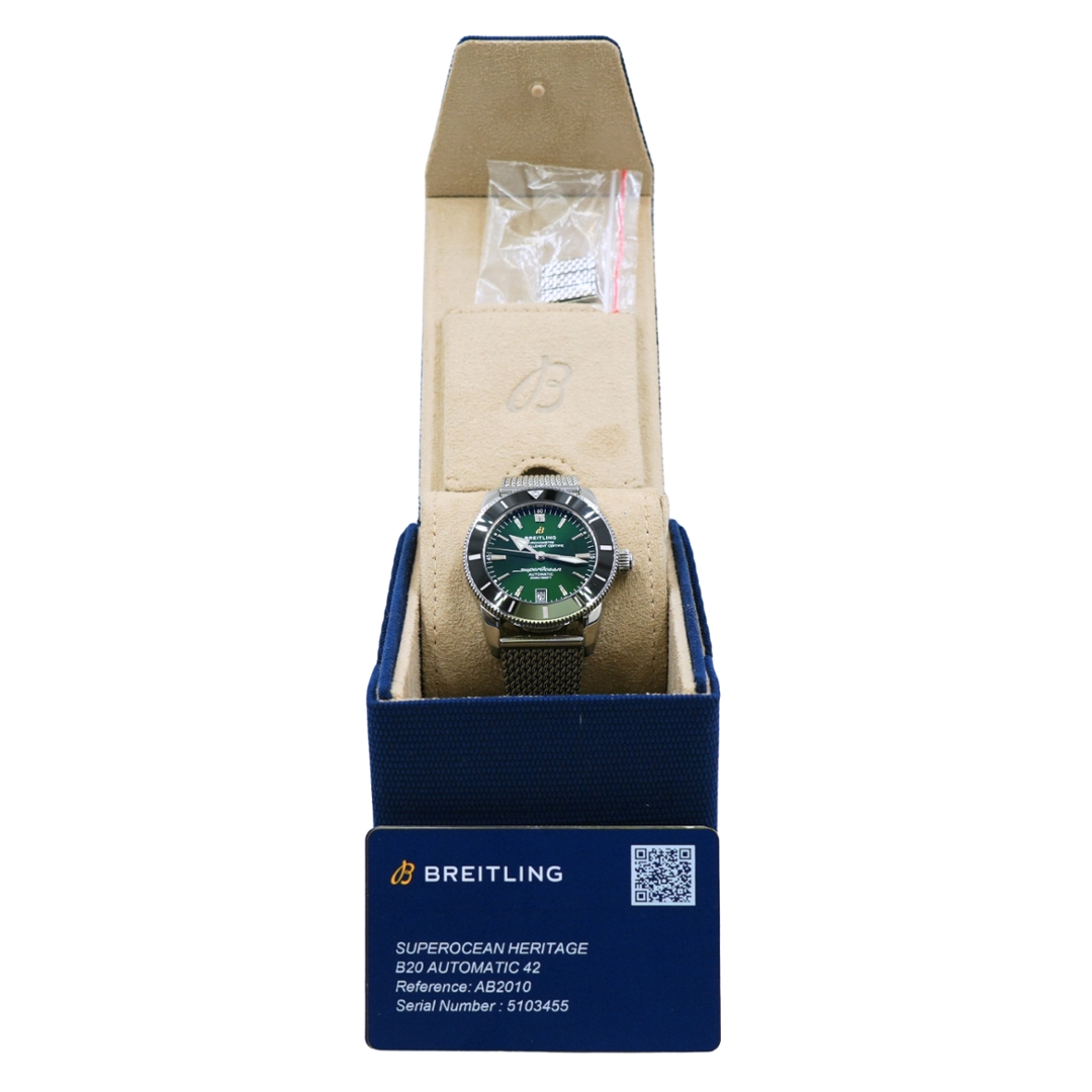 A Breitling Superocean Heritage B20 42 Watch that delivers rugged capability with refined style, this 2022 model AB2010 is built for those who demand performance above and below the surface. Crafted in stainless steel with a 42mm case, it features a bold black unidirectional bezel and a green dial, offering a clean, functional, and striking look.