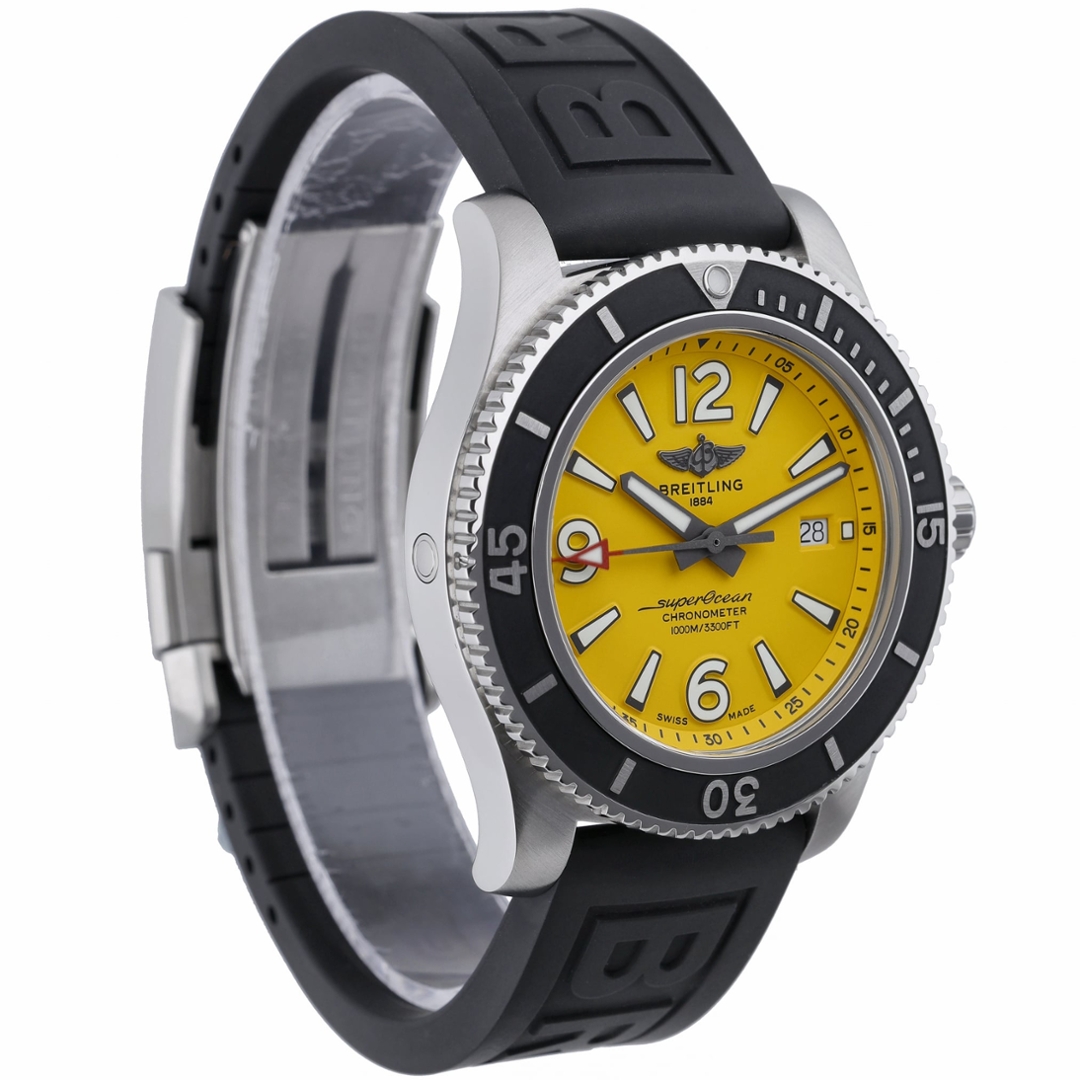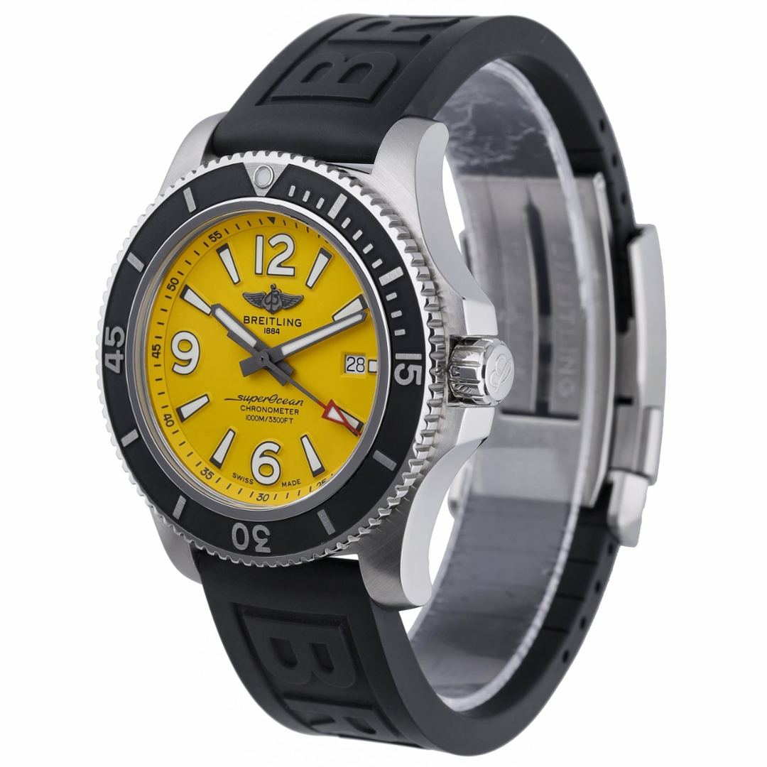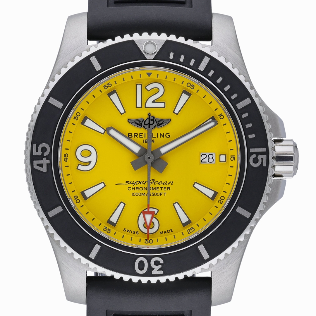 A Breitling Superocean 44 reference A173670 features a 44mm stainless steel case, paired with a black rubber strap secured by a stainless steel clasp. The watch features a high-contrast yellow dial with oversized luminous Arabic numerals and hands, designed for maximum legibility. It is framed by a black unidirectional bezel with minute markings, while the date display is positioned cleanly at 3 o’clock, reinforcing its functional dive-watch layout.