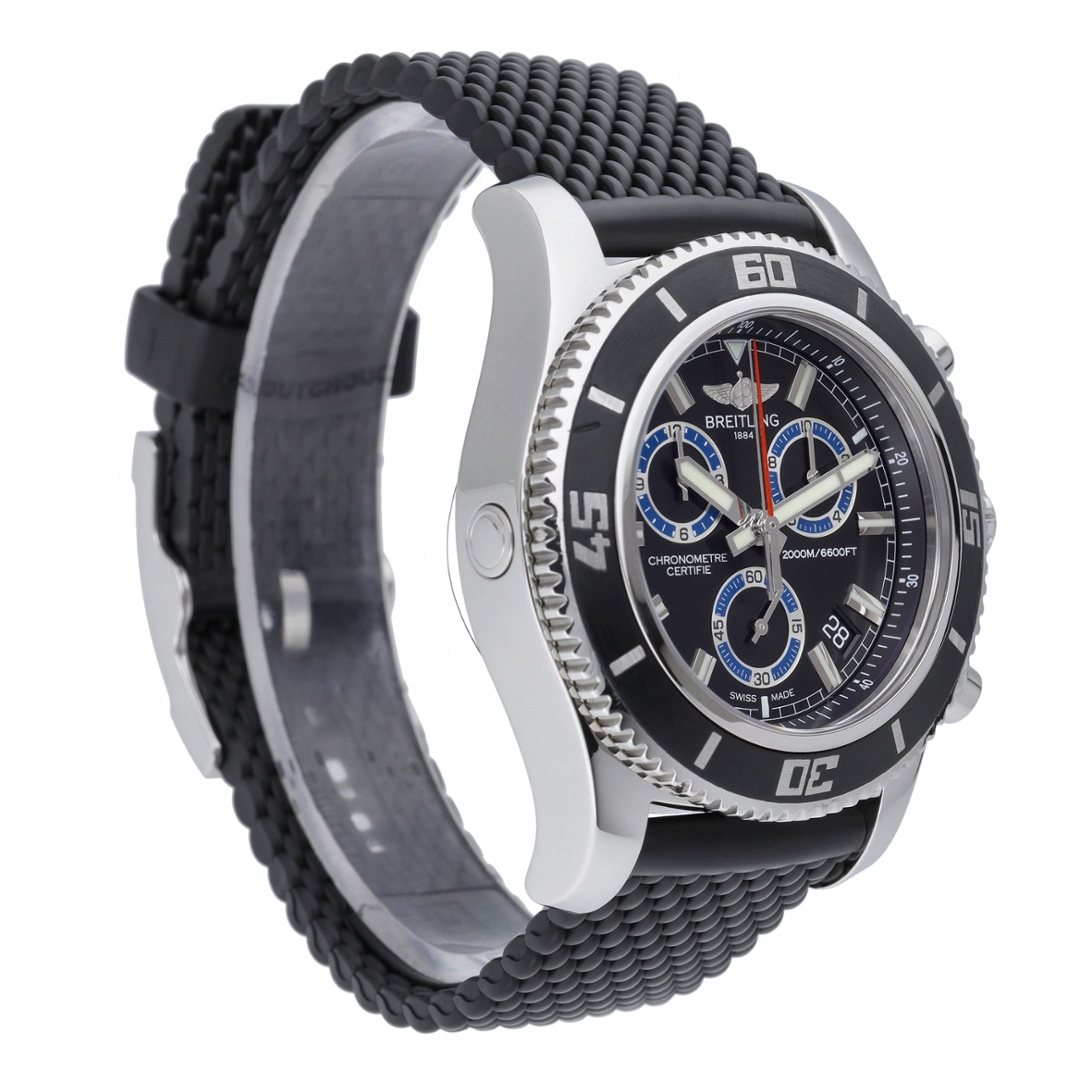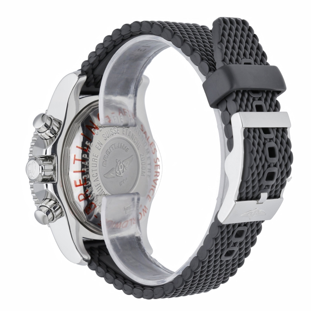 Completing the watch is a durable black rubber strap secured with a stainless steel clasp, designed to offer comfort and flexibility in demanding environments. Bold, highly capable, and engineered for serious underwater performance, the Breitling Superocean Chronograph stands as one of the brand’s most powerful professional dive watches.