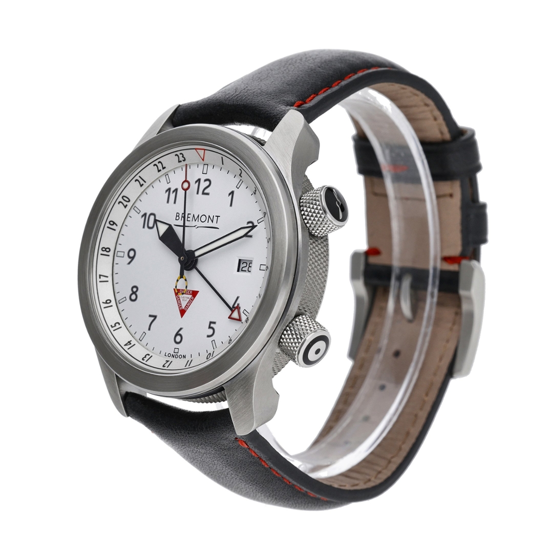 A Bremont Martin Baker, reference MBIII-WH/LE, is a robust pilot’s watch developed in collaboration with the British ejection seat manufacturer Martin-Baker. Its 43mm stainless steel case is constructed with Bremont’s Trip-Tick design, ensuring both durability and comfort on the wrist. The white dial provides excellent legibility, featuring bold Arabic numerals, luminous hands, a GMT hand for tracking a second time zone, and a discreet date display at 3 o’clock. A black leather strap with red stitching complements the aviation-inspired design.
