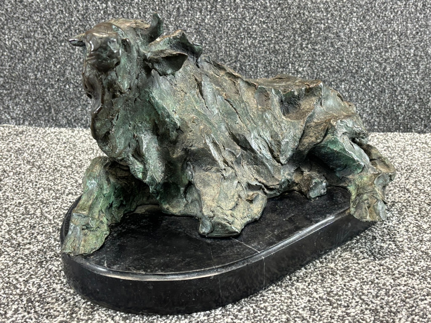 A bronze sculpture of a Bison on a green marble base. Approx 27cm height, 44cm width, 24cm depth.