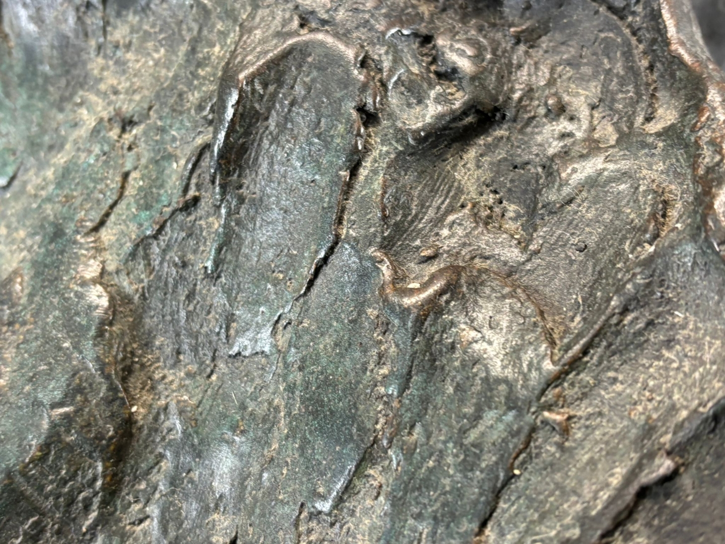 Resting on a beautifully shaped green marble base, the bison’s earthy patina harmonises perfectly with the deep veining of the stone. The contrast between the smooth marble and rugged bronze creates a captivating interplay of materials, showcasing both craftsmanship and balance.