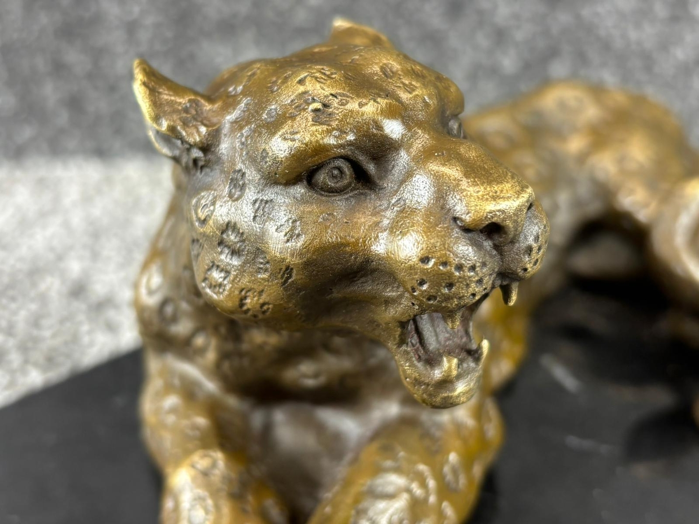 A finely cast bronze sculpture of a reclining leopard, captured in a poised and alert position that conveys both elegance and latent power. The figure is rich in detail, with carefully defined musculature and a textured surface that highlights the animal’s distinctive spotted coat. Its open mouth and focused expression add a sense of tension and realism, bringing the subject vividly to life.
