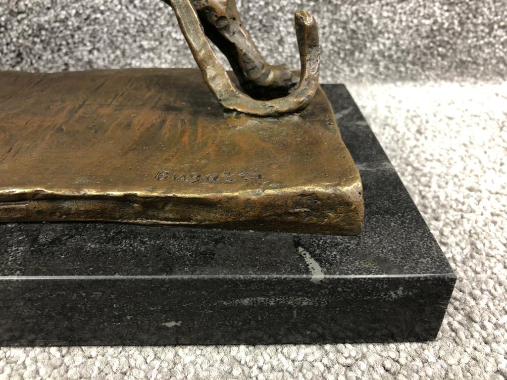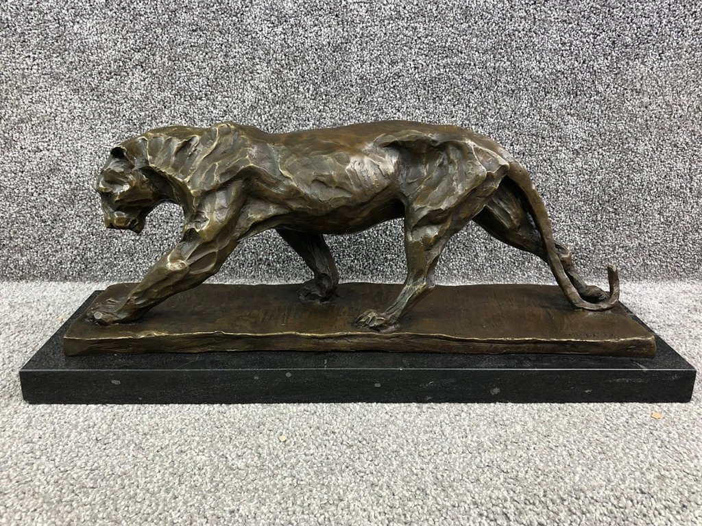 A bronze sculpture of a Walking Leopard on a black marble base. Approx 9" height, 21" width.