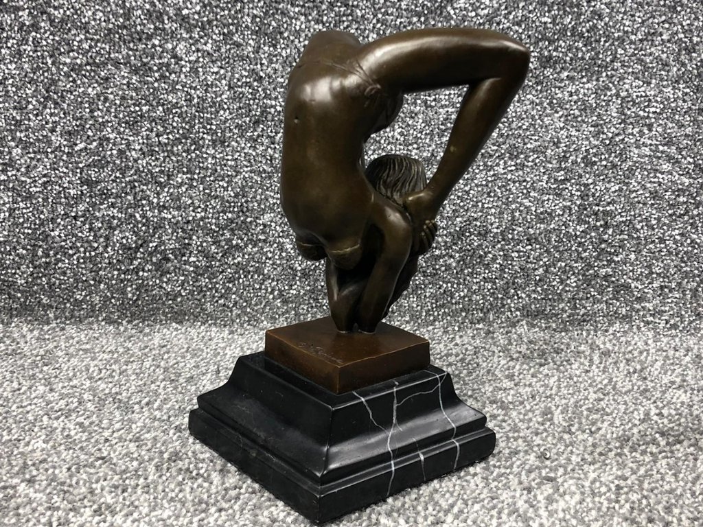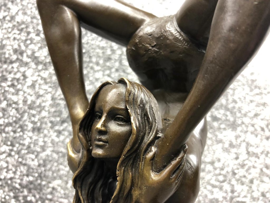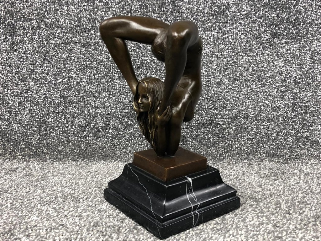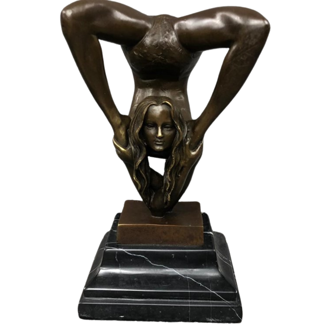 A bronze sculpture of a Lady in a Yoga pose on a black marble base. Approx 9" height.