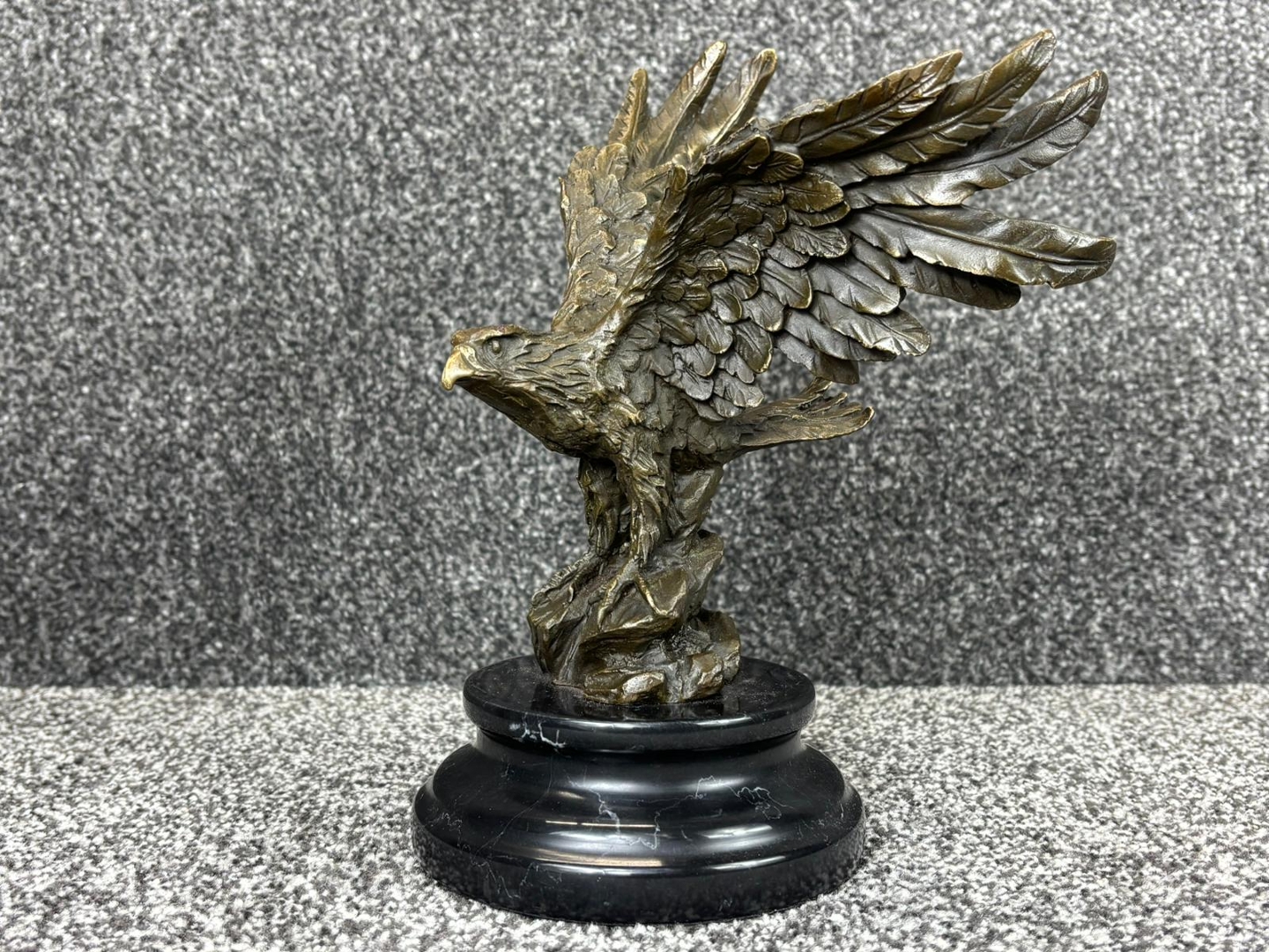 A bronze sculpture of an Eagle in Mid-Ascent on a black base. Approx 23cm height, 19cm width, 15cm depth.