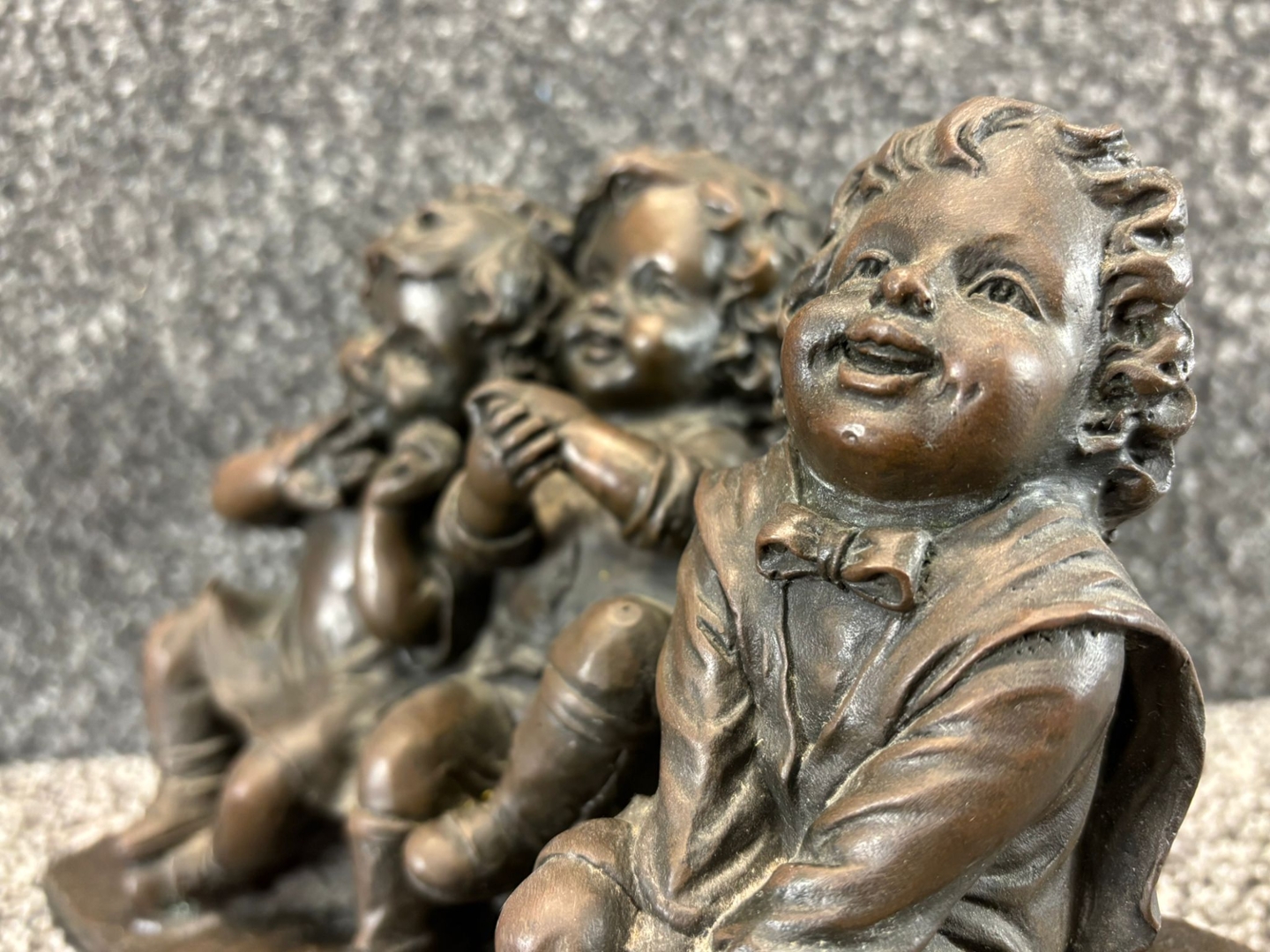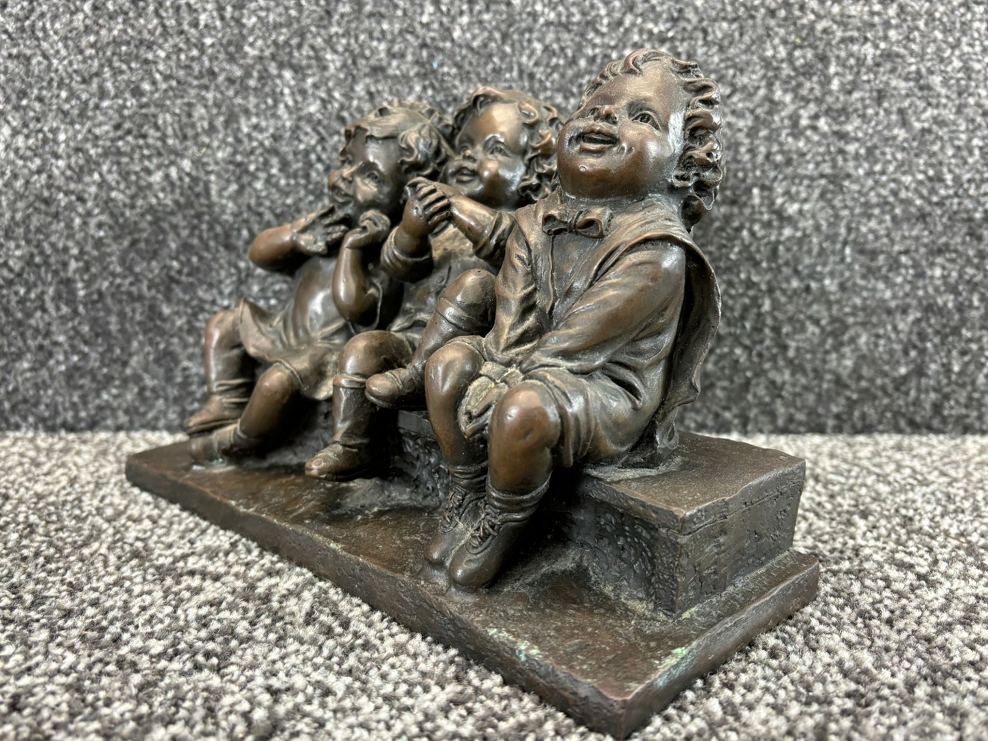A bronze sculpture of Laughing Children. Approx 15cm height, 23cm width, 9cm depth.