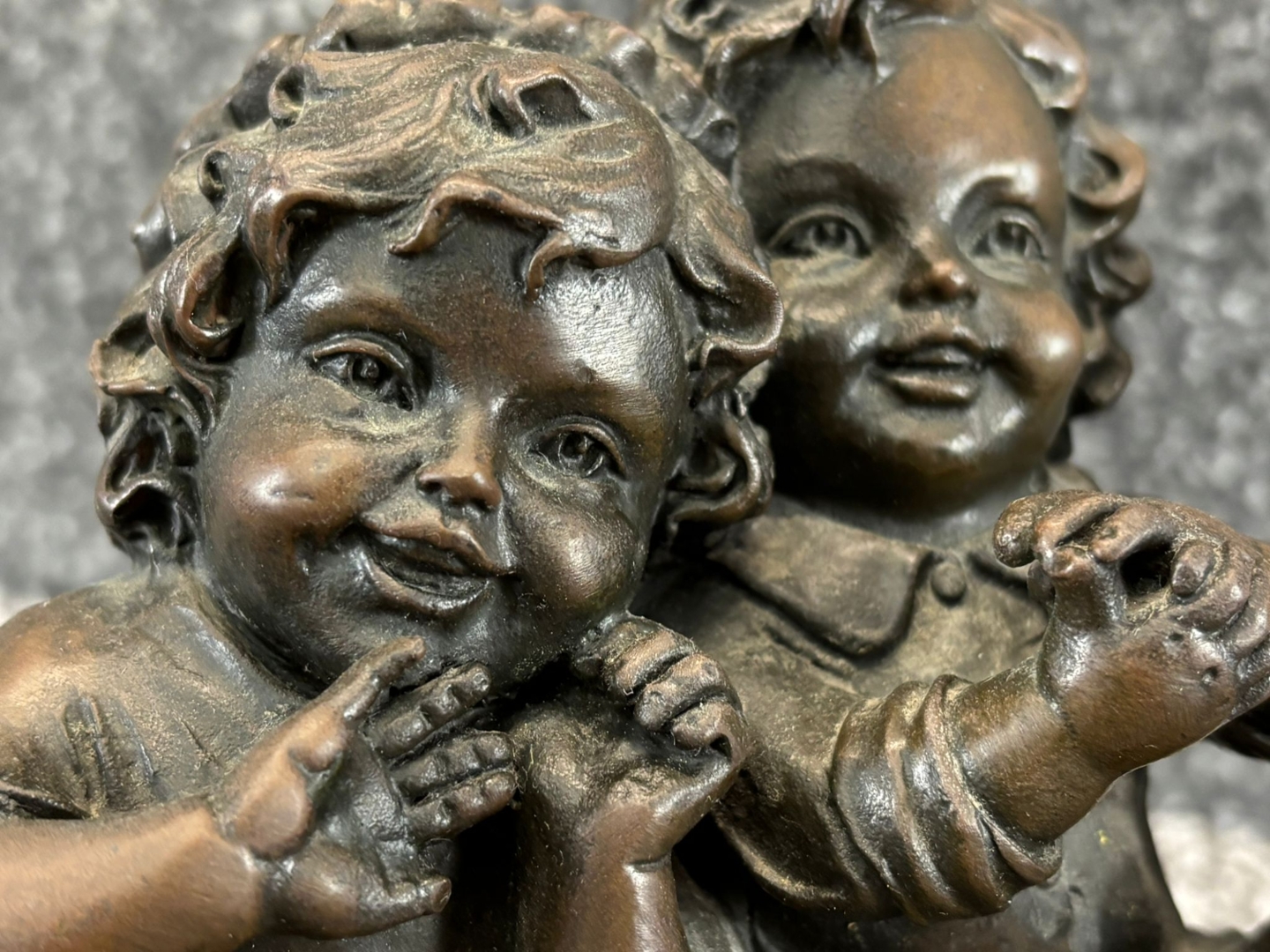The bronze surface carries a rich, warm patina that enhances the depth and texture of the figures, giving the sculpture a timeless quality. The solid base provides a sense of grounding and balance, making it a delightful display from every angle.