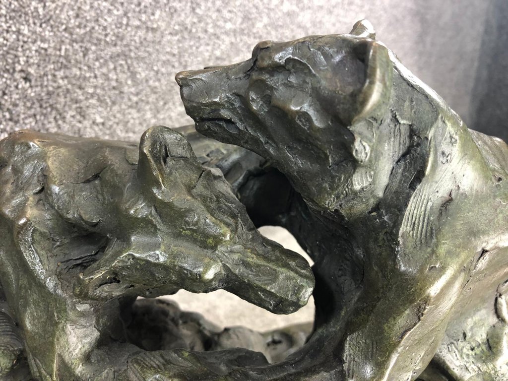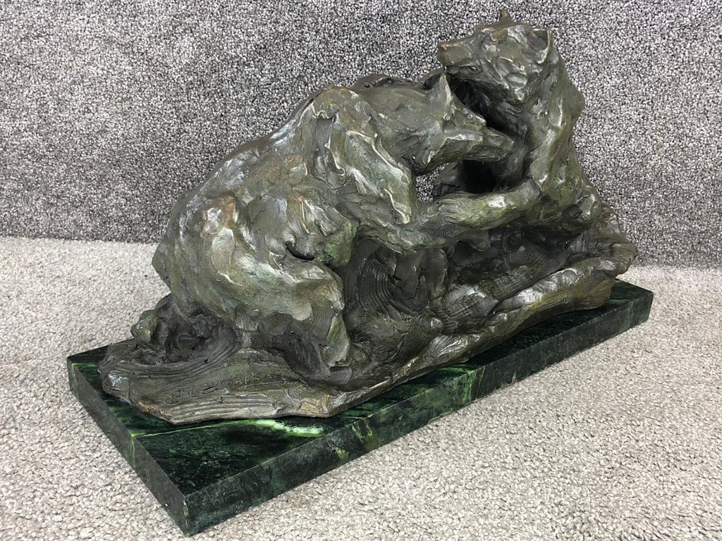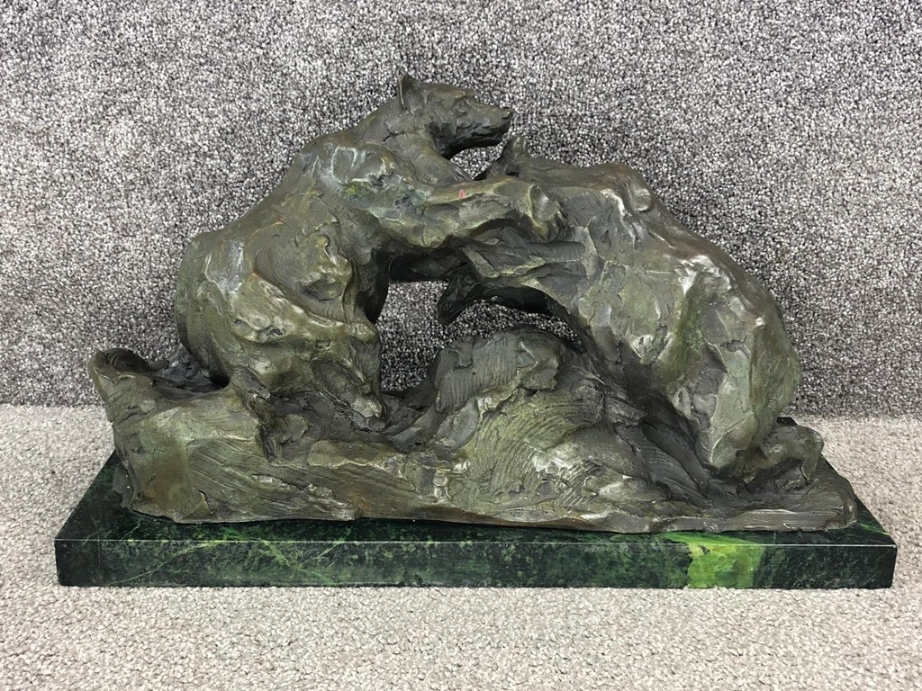 A bronze sculpture of playful Bears on a green marble base. Approx 11" height, 20" width.