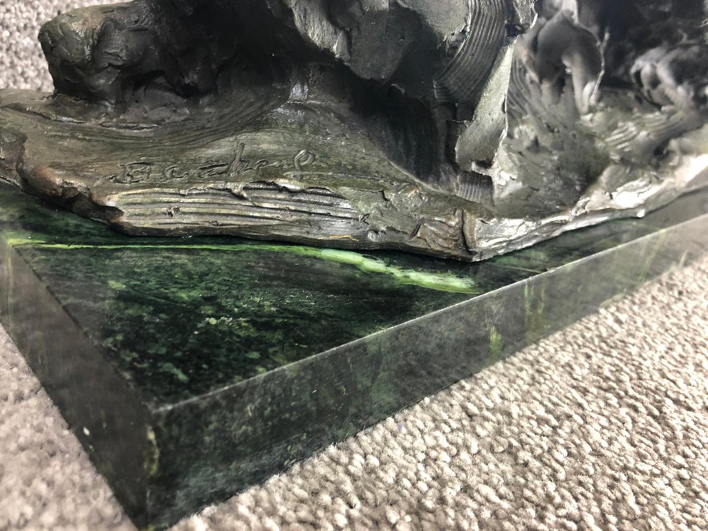 Resting on a beautifully veined green marble base, the sculpture achieves a perfect balance between rugged wilderness and refined artistry. The deep green tones of the marble complement the rich bronze patina, enhancing the overall visual depth and sophistication of the piece.
