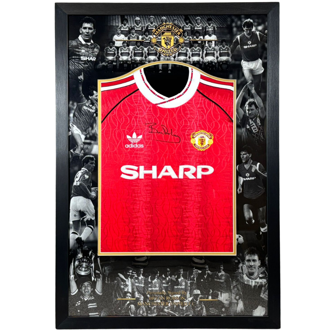 The classic red Adidas shirt, complete with the iconic Sharp sponsor logo, proudly bears Bryan Robson’s signature on the chest. Surrounding the shirt is a dynamic montage of black-and-white action shots capturing unforgettable moments from Robson’s celebrated career at Old Trafford, along with the official Manchester United crest.