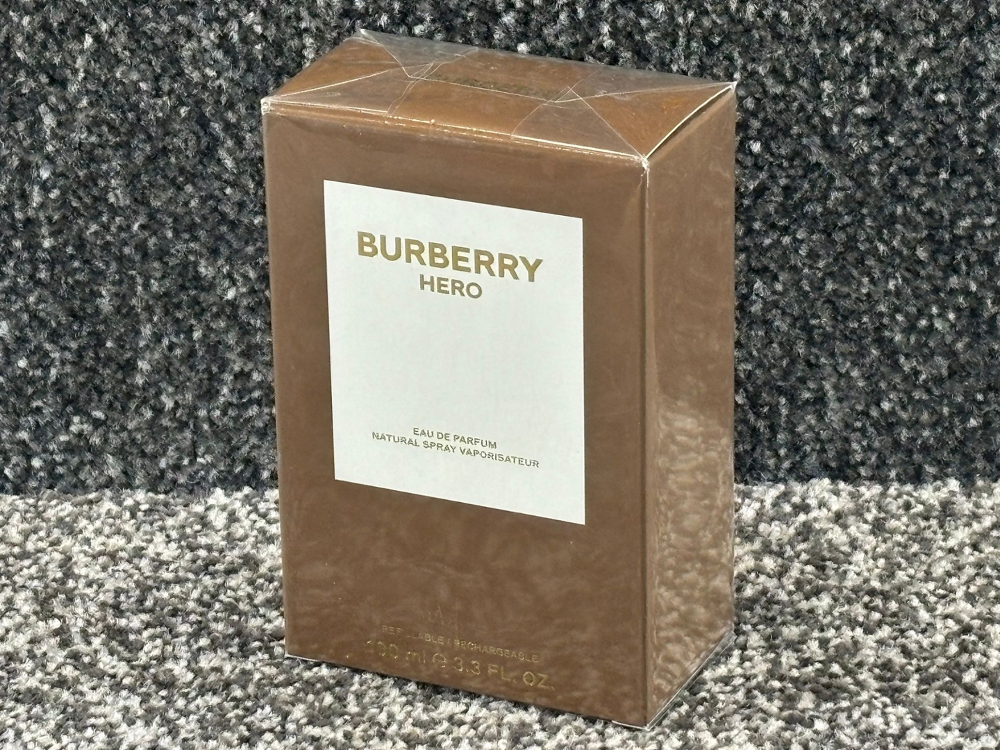 A bottle of Burberry Hero Eau De Parfum, presented in its original presentation box and embodying the strength, confidence and modern elegance associated with the Burberry name. This contemporary fragrance offers a bold yet refined character, designed to reflect a sense of individuality and quiet power.