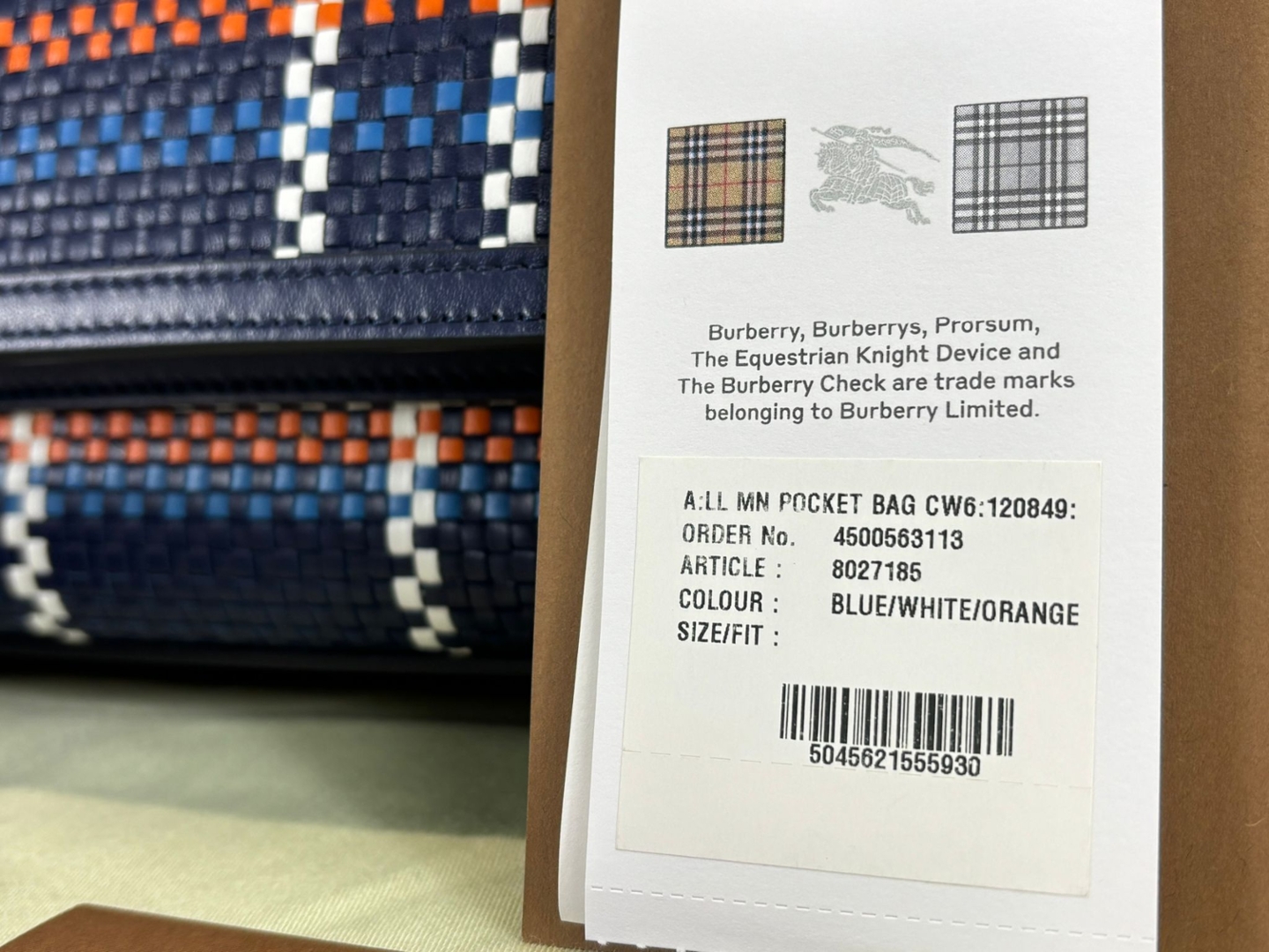 A brand new Burberry blue smooth calf leather with woven check panel Banner Top Handle bag, Approximately 26cm height, 23cm width.