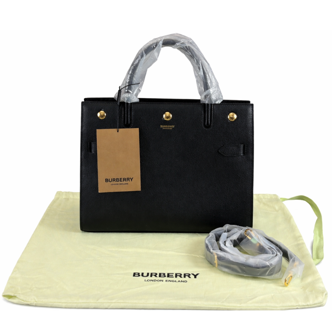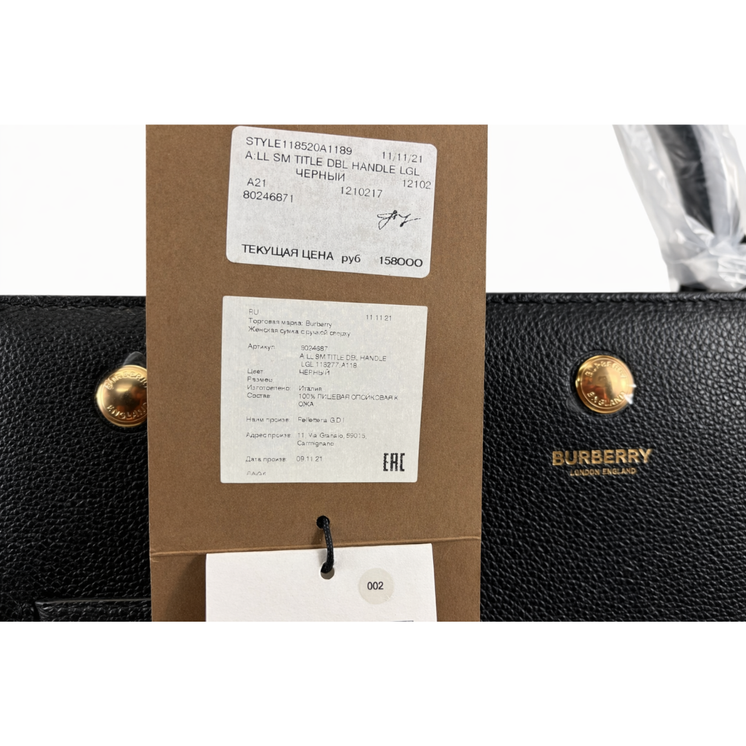 A brand new Burberry Double Handle Tote Bag, showcasing a refined and structured silhouette crafted from richly grained leather. The timeless black finish is elevated by subtle gold-tone hardware detailing and understated Burberry branding, delivering a clean and sophisticated aesthetic that aligns seamlessly with the house’s heritage design language.