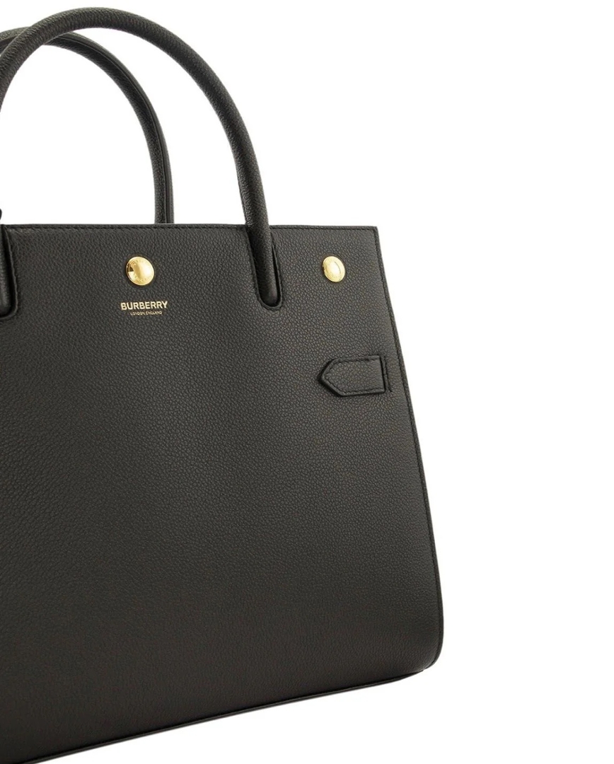 A brand new Burberry Double Handle Tote Bag, showcasing a refined and structured silhouette crafted from richly grained leather. The timeless black finish is elevated by subtle gold-tone hardware detailing and understated Burberry branding, delivering a clean and sophisticated aesthetic that aligns seamlessly with the house’s heritage design language.