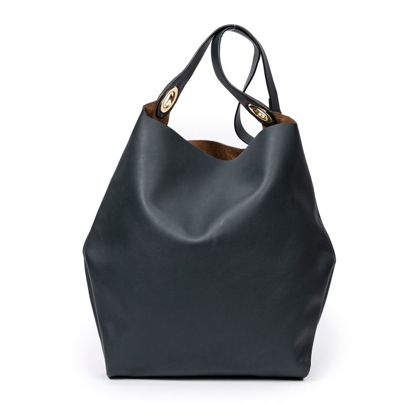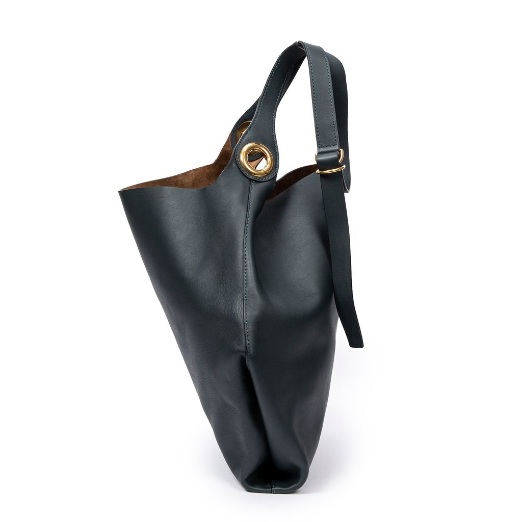 A Vintage Burberry Dark Green Calf Leather Large Eyelet Grommet Hobo Bag with a Certificate of Authenticity, Approximately 44cm Height, and 35cm Width.