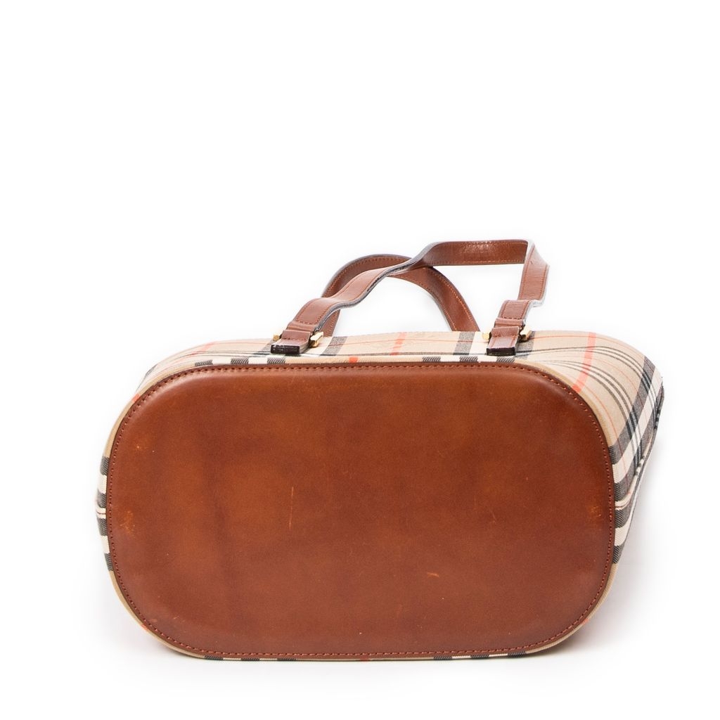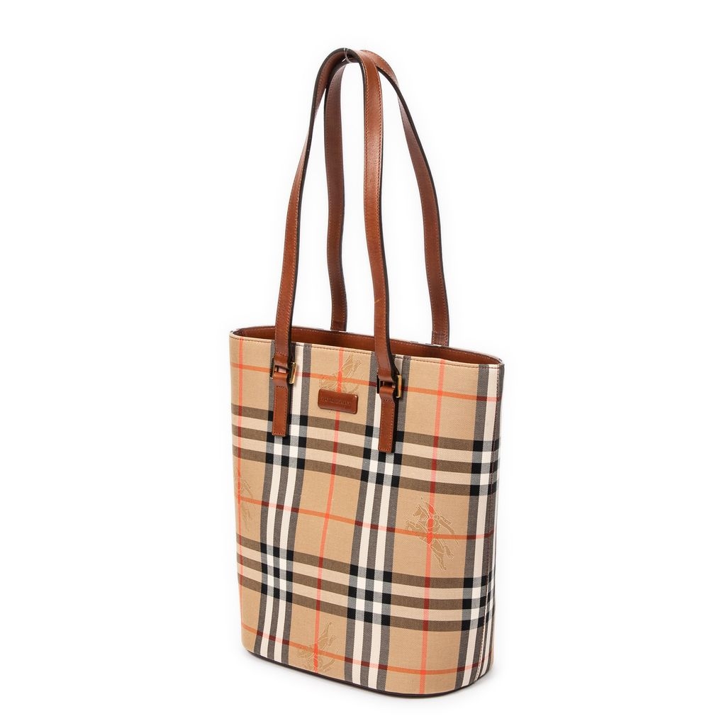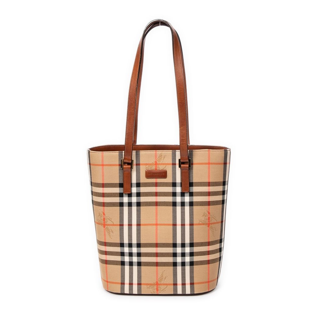 A vintage Burberry beige/brown canvas Open Bucket Tote bag with a certificate of authenticity, Approximately 28cm height, 23cm width.