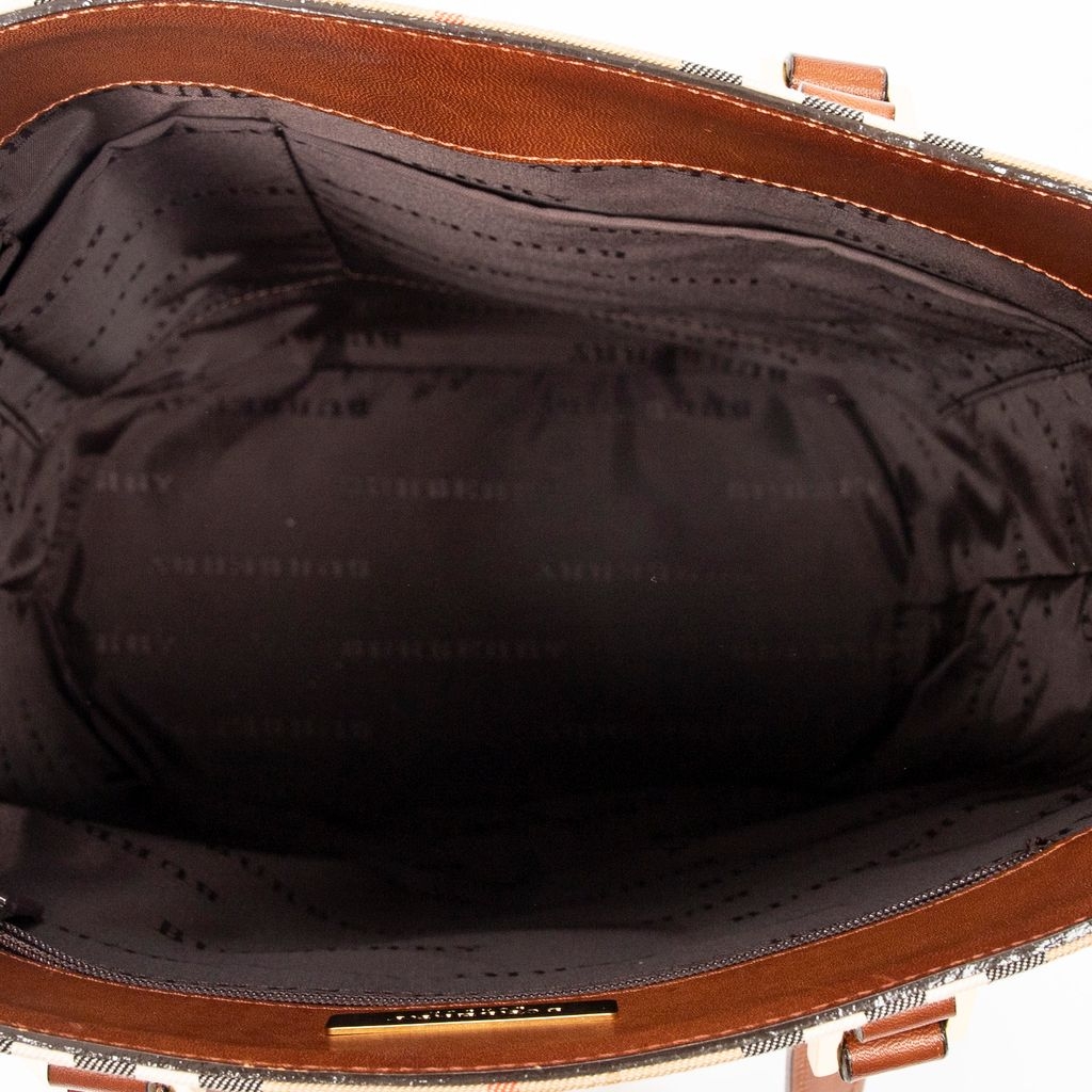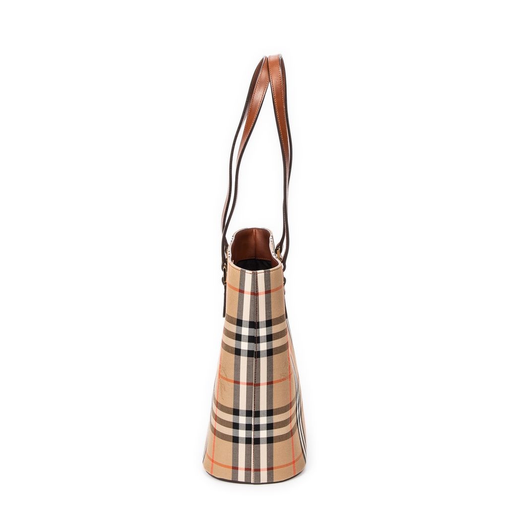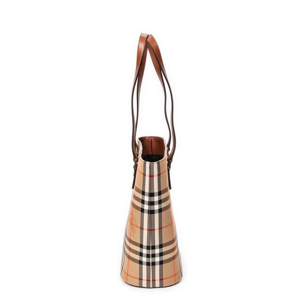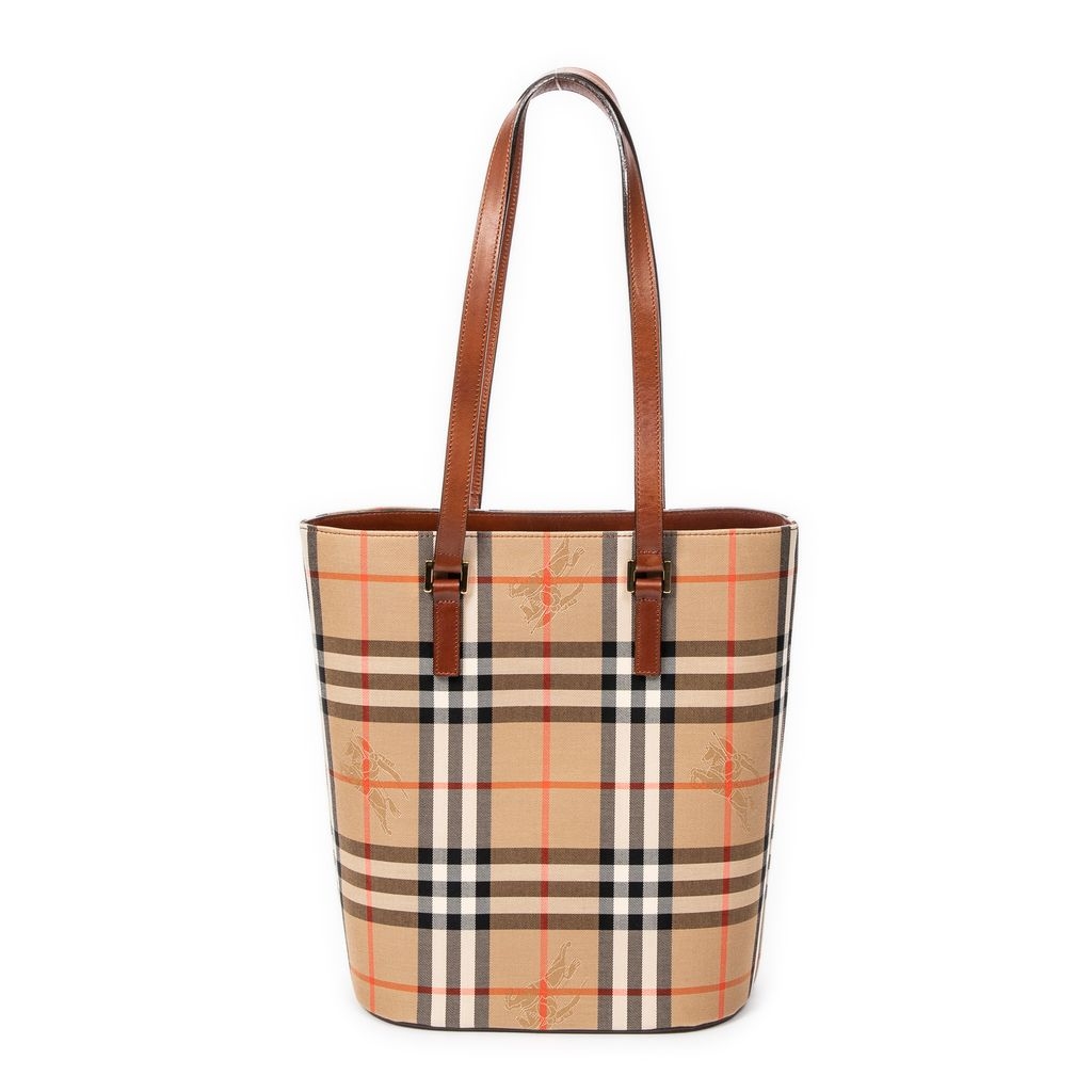 A vintage Burberry beige/brown canvas Open Bucket Tote bag with a certificate of authenticity, Approximately 28cm height, 23cm width.