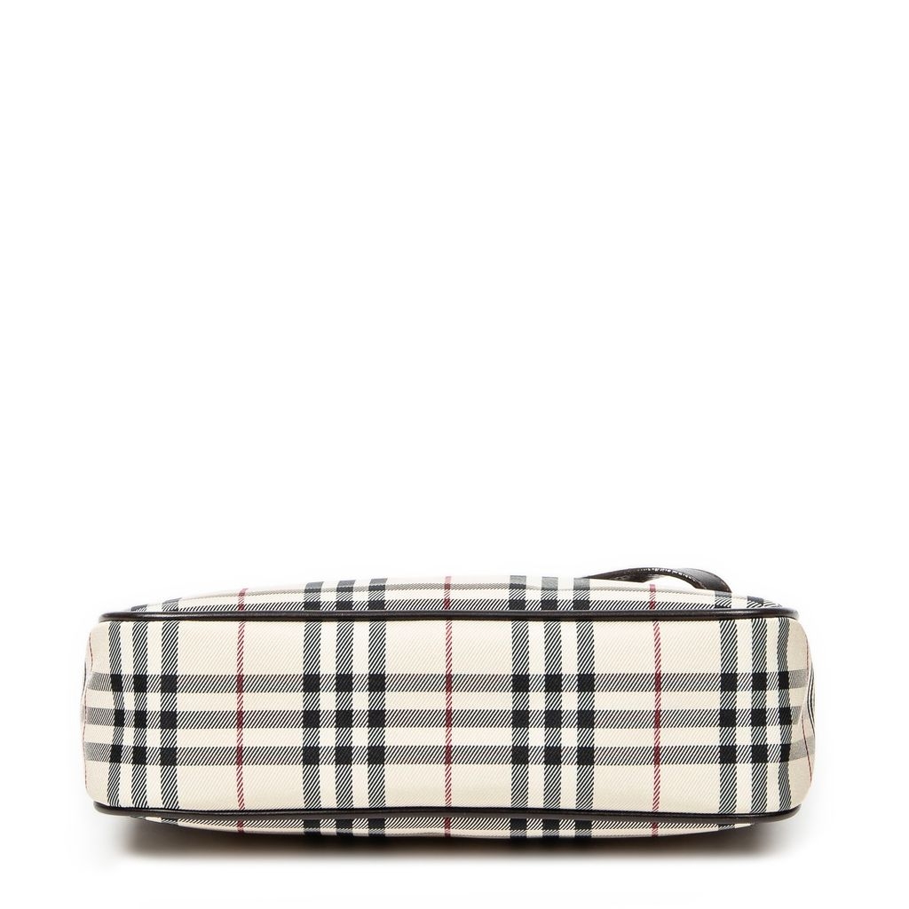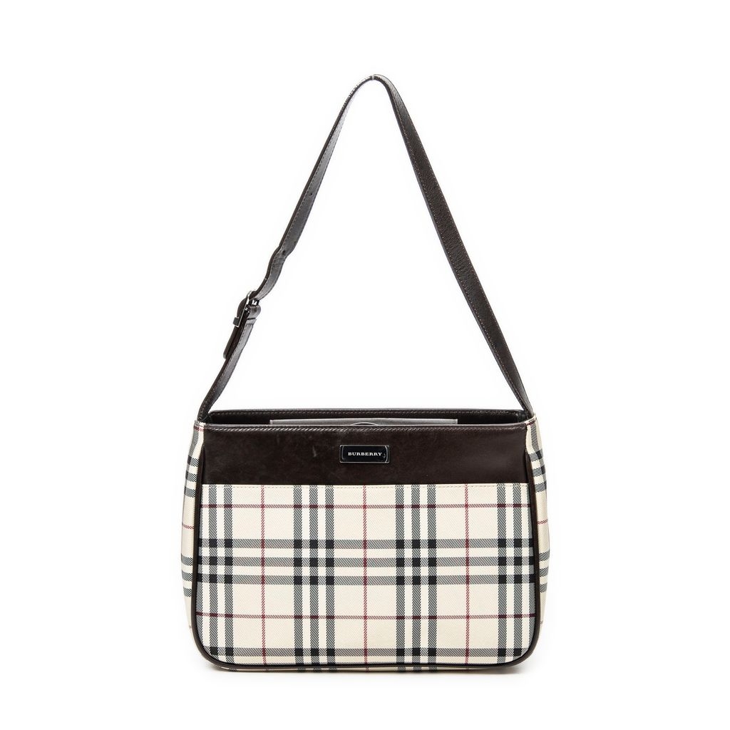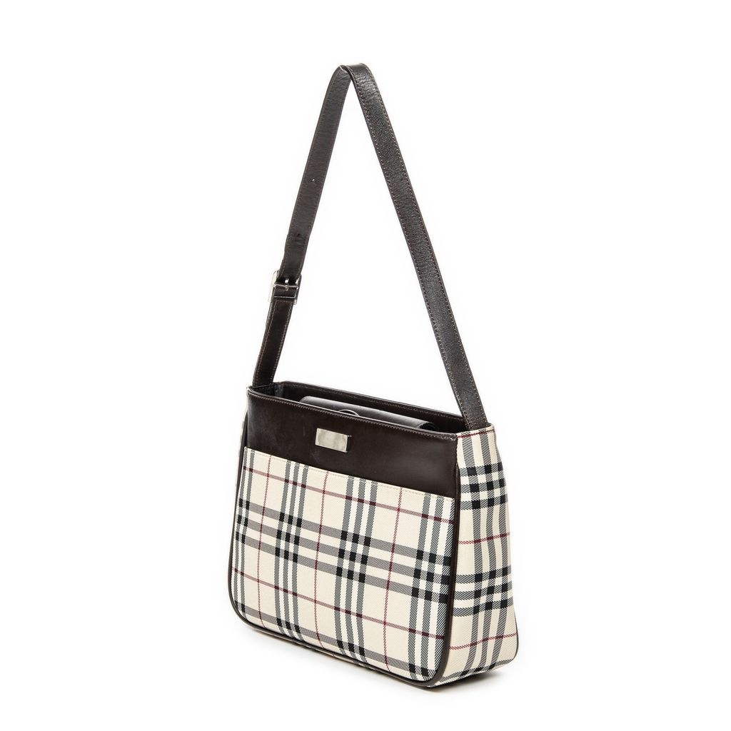 A vintage Burberry beige/dark brown canvas Rectangular Slip Pocket Shoulder Bag with a certificate of authenticity, Approximately 19cm height, 27cm width.