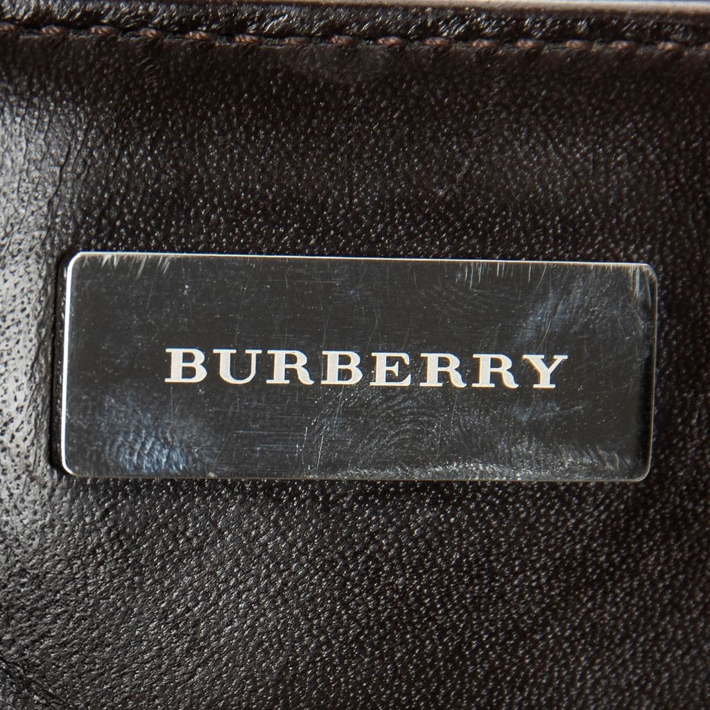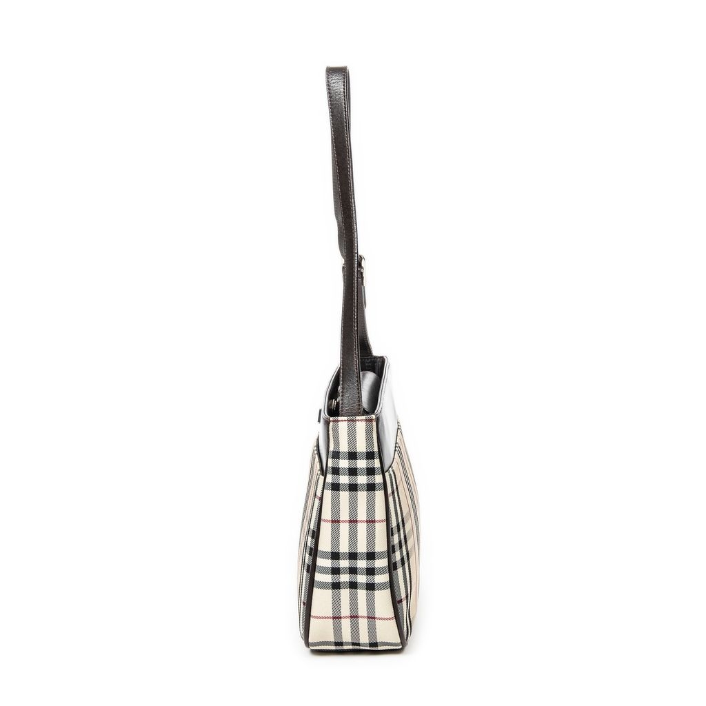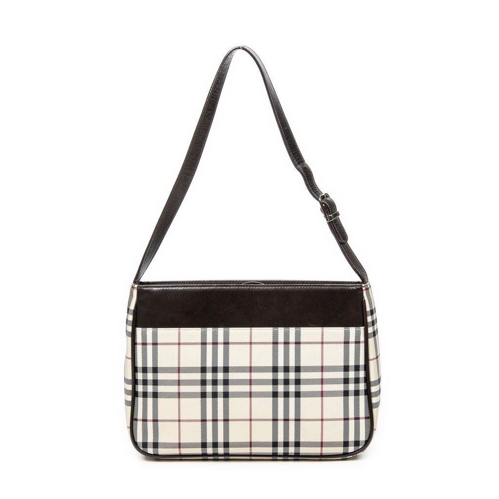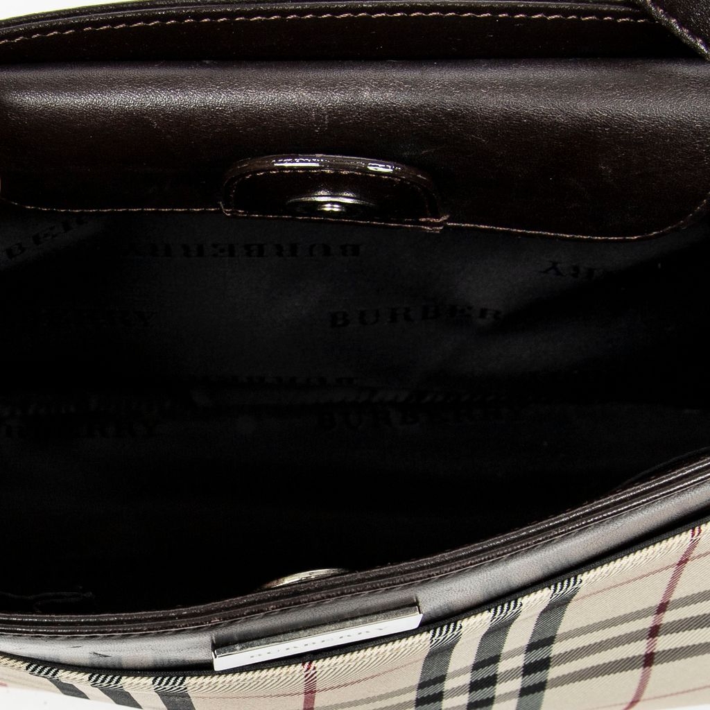 A vintage Burberry beige/dark brown canvas Rectangular Slip Pocket Shoulder Bag with a certificate of authenticity, Approximately 19cm height, 27cm width.