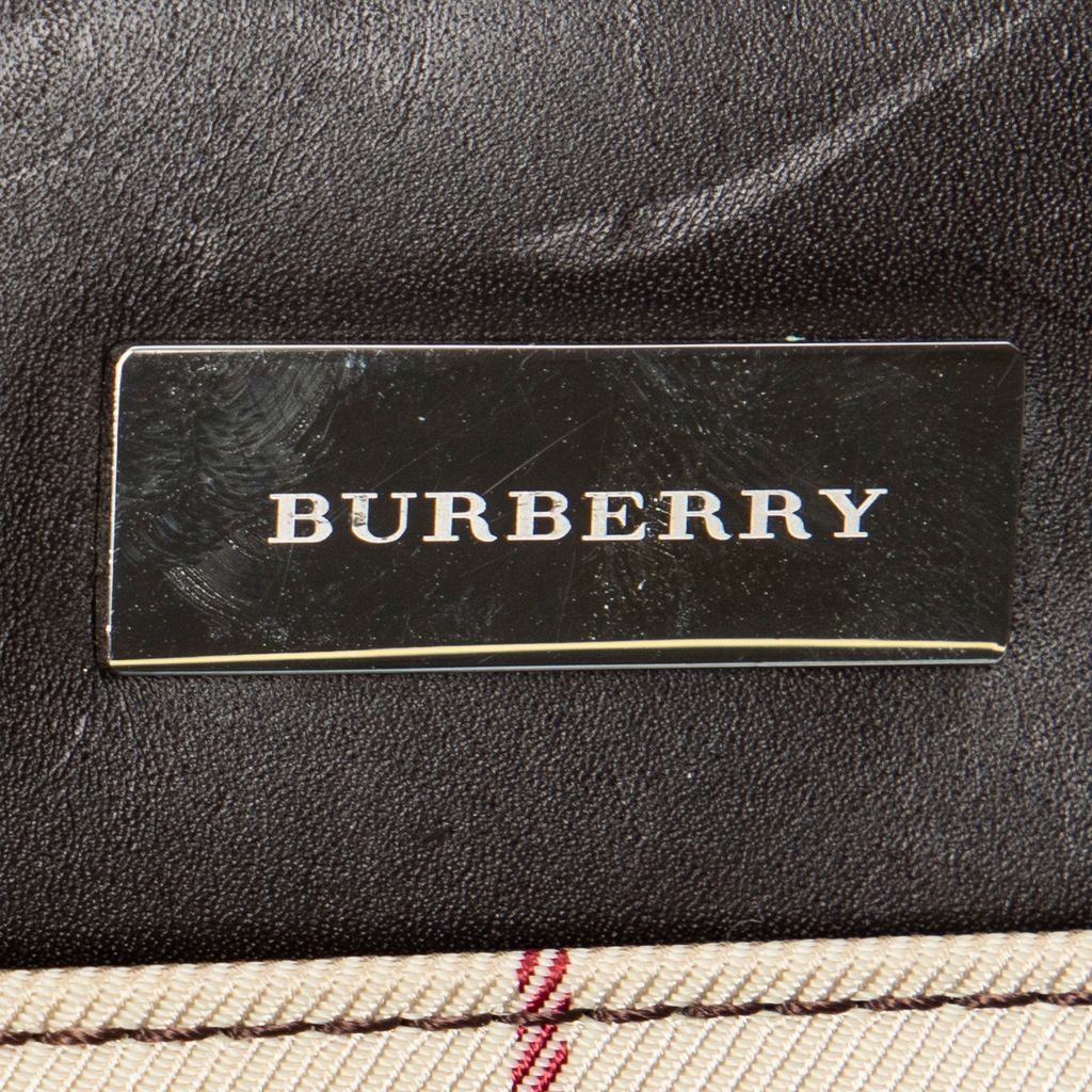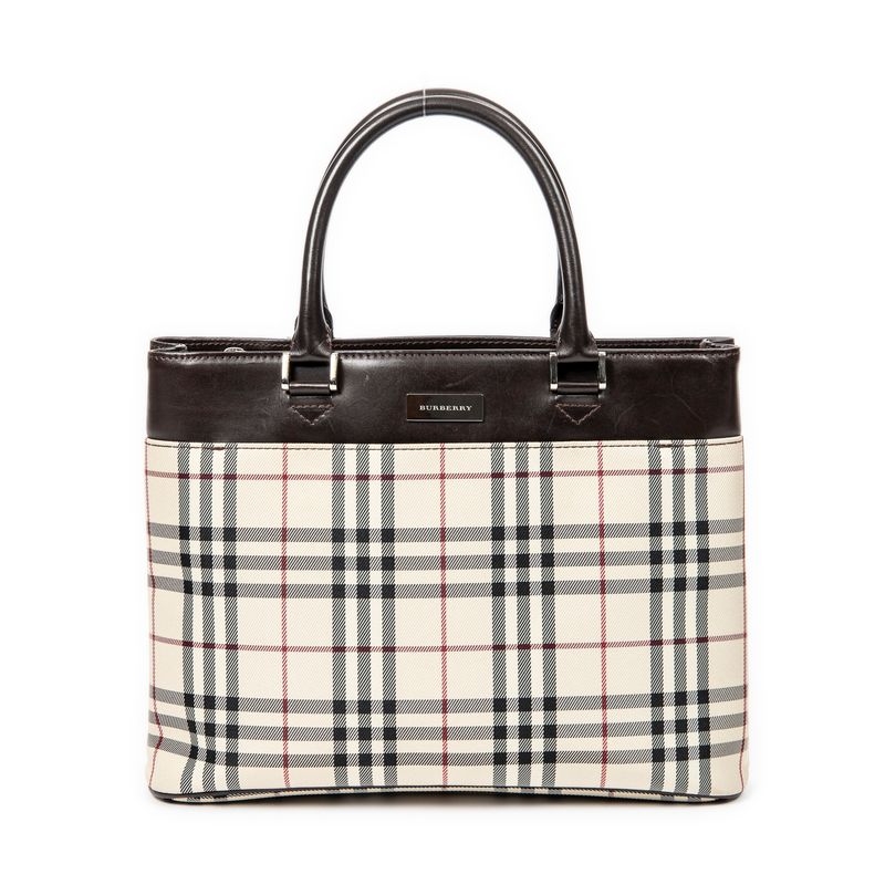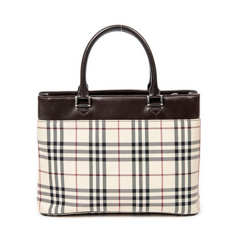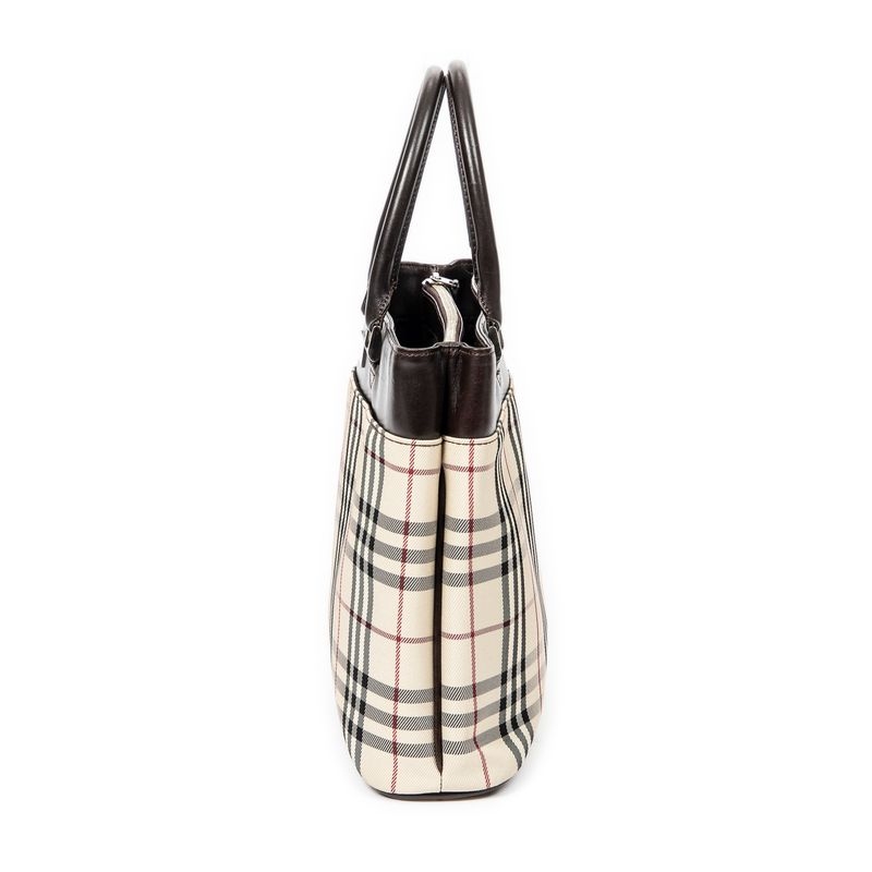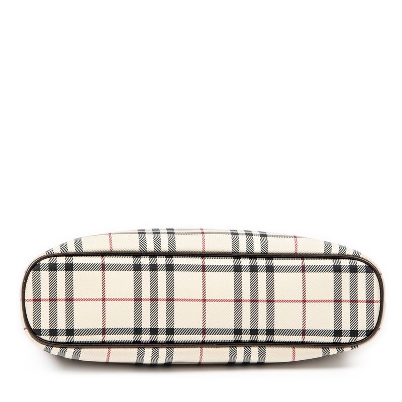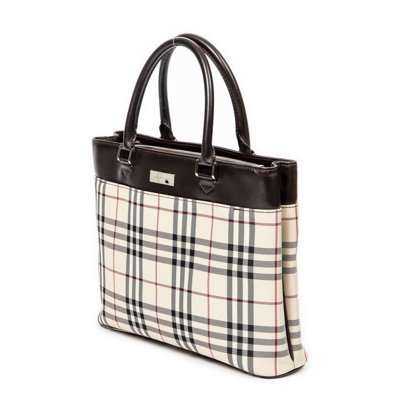 A vintage Burberry beige/dark brown canvas slip pocket zip tote bag with a certificate of authenticity, Approximately 24cm height, 32cm width.