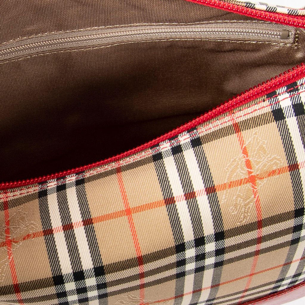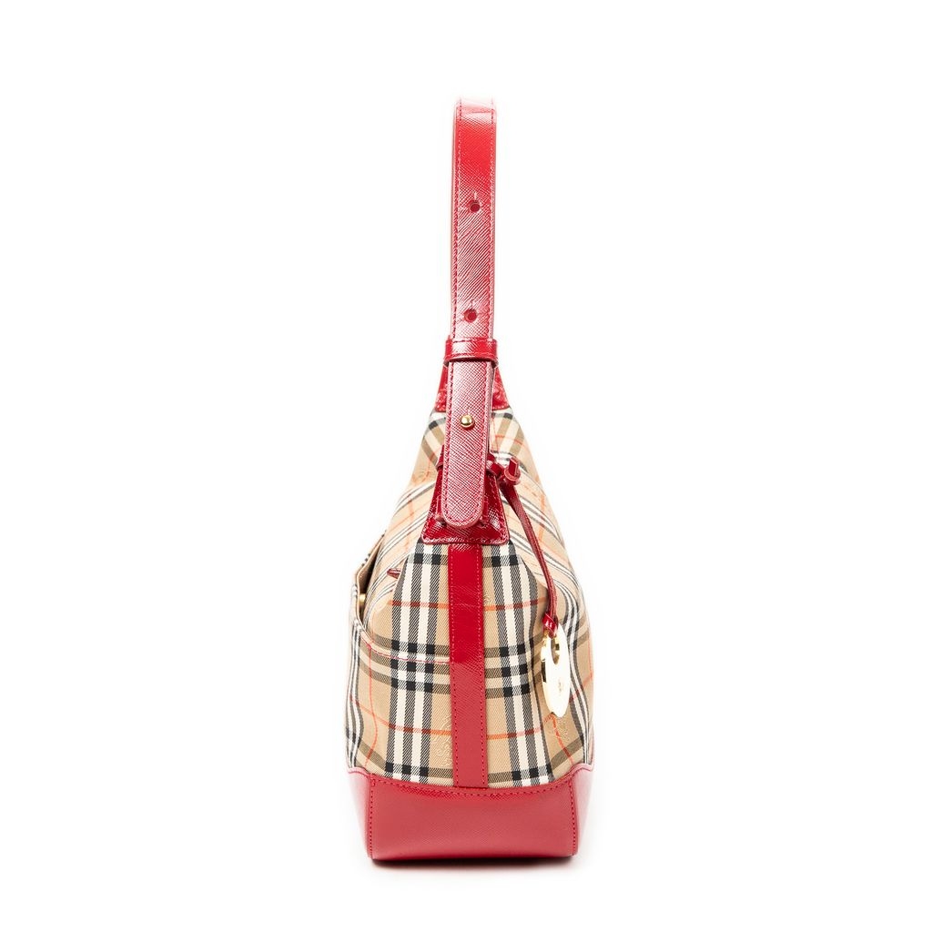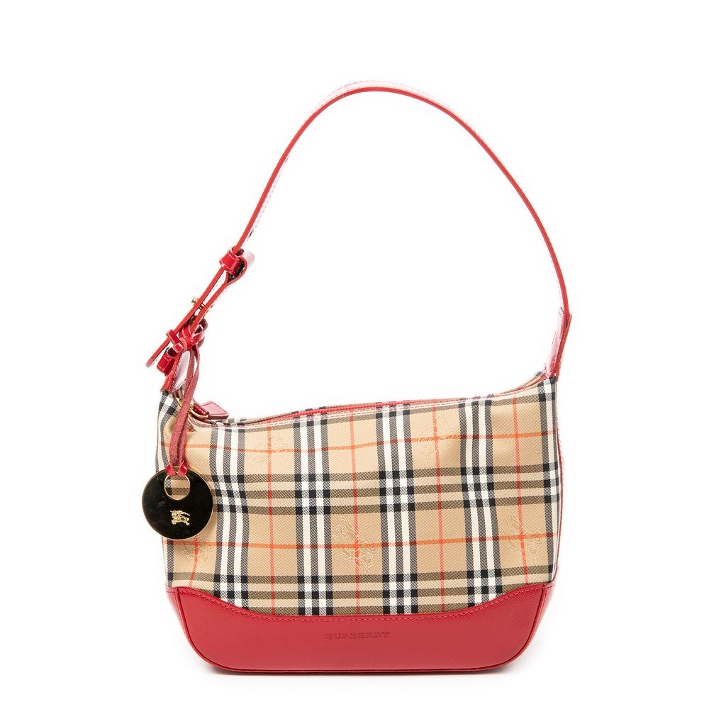 A vintage Burberry beige/red canvas Small Zip Charm Hobo bag with a certificate of authenticity, Approximately 16cm height, 22cm width.