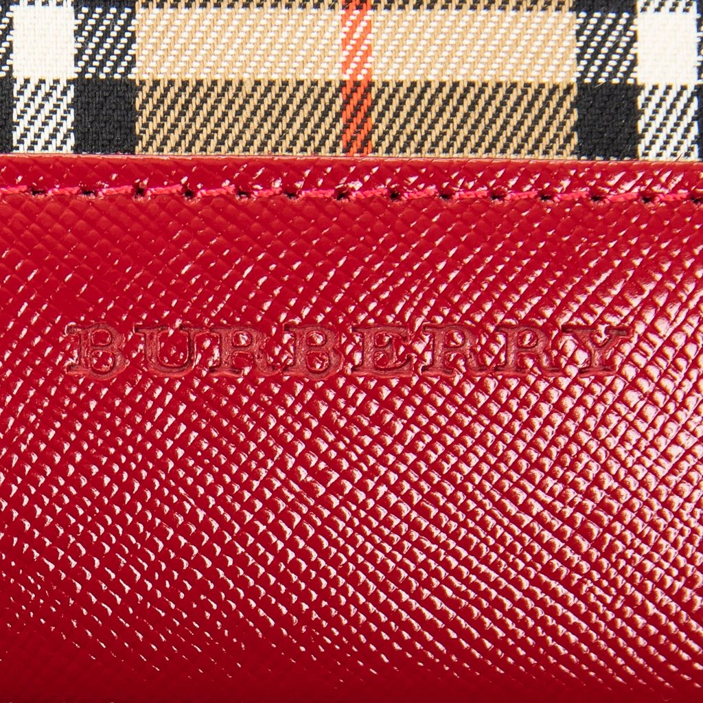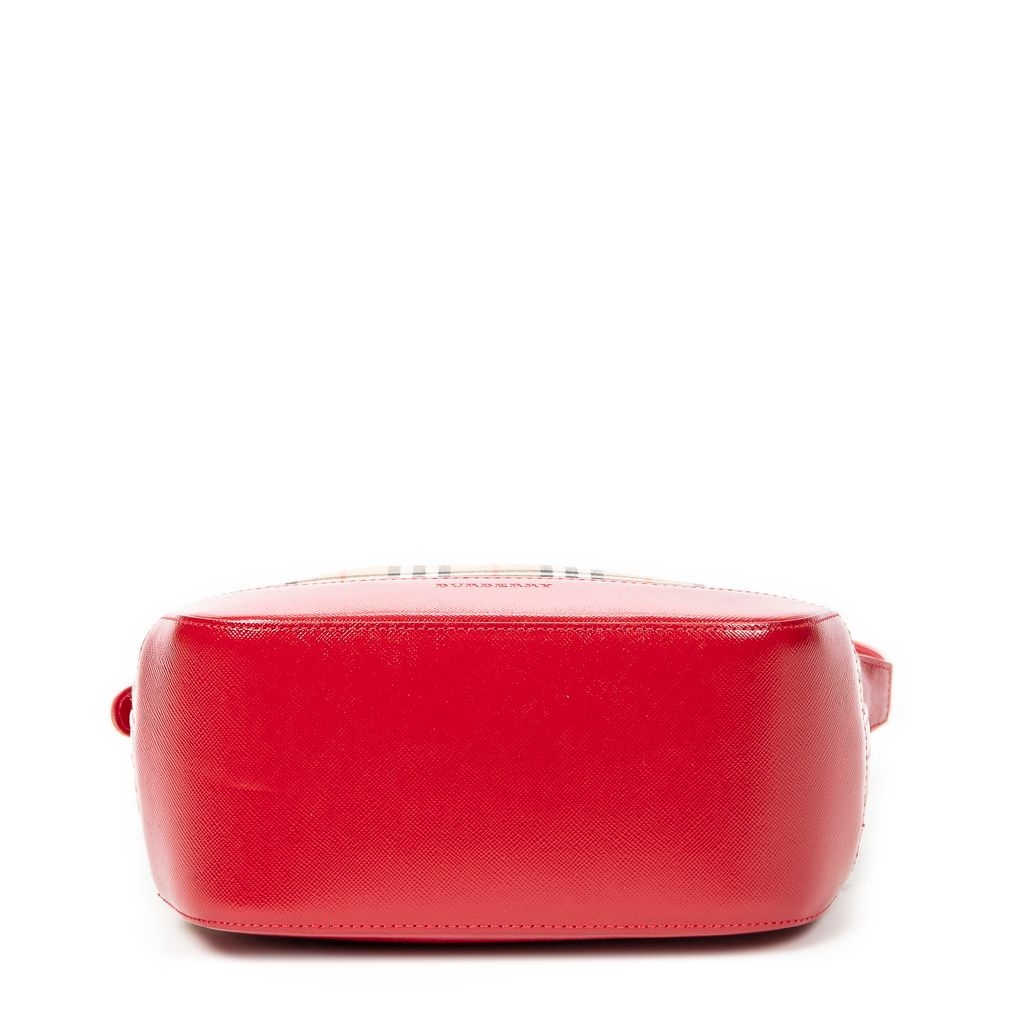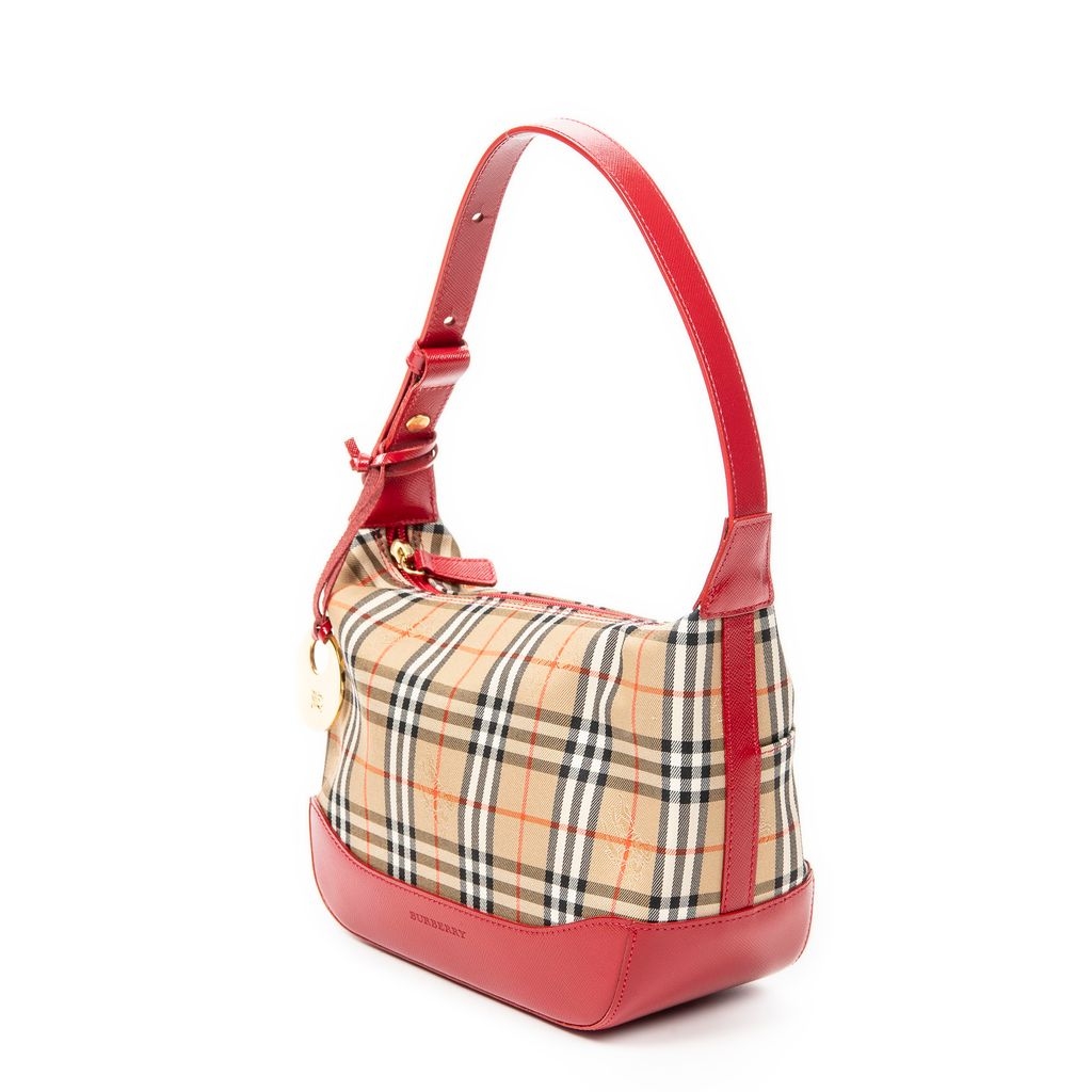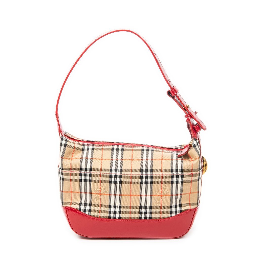 A vintage Burberry beige/red canvas Small Zip Charm Hobo bag with a certificate of authenticity, Approximately 16cm height, 22cm width.