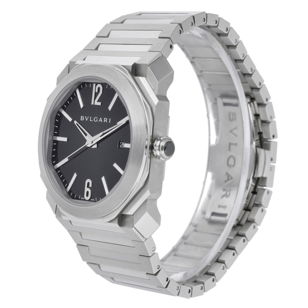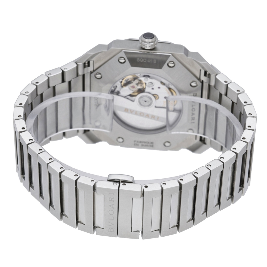 Powered by the Bvlgari Calibre BVL 193 automatic movement, this watch offers impeccable precision, durability, and a power reserve of approximately 50 hours. The sapphire crystal case back reveals the beautifully decorated movement within, a testament to Bvlgari’s commitment to fine watchmaking. The integrated stainless steel bracelet mirrors the case’s angular design, creating a seamless, contemporary look that sits comfortably on the wrist.