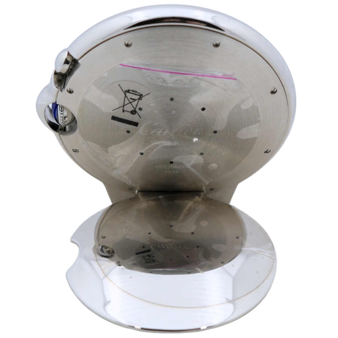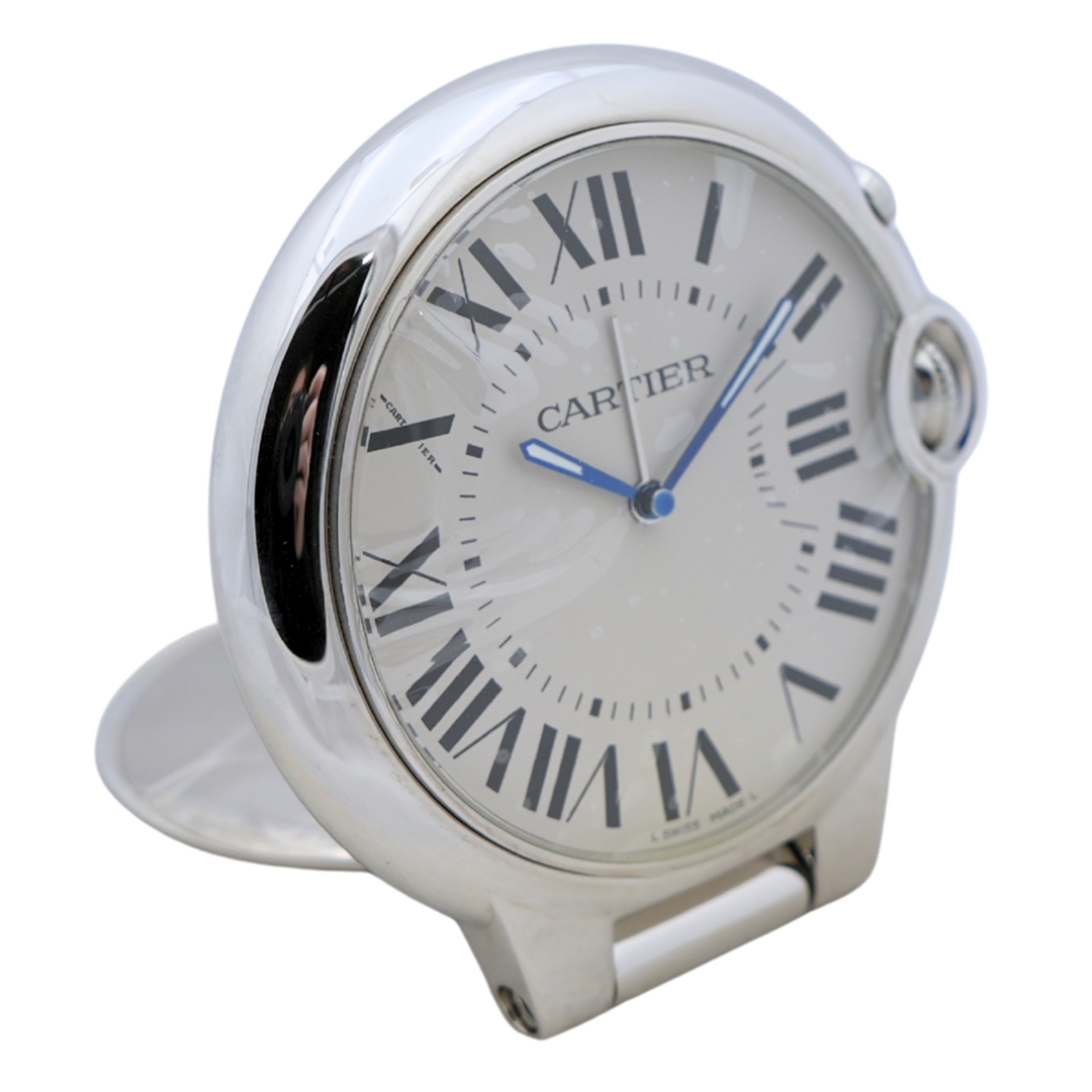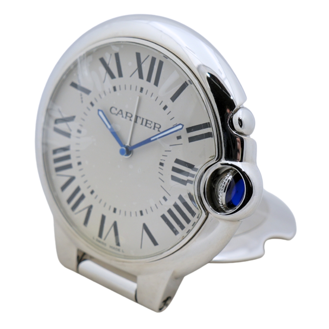 Inspired by one of Cartier’s most iconic watch designs, the Ballon Bleu Desk Clock captures the same sense of refined luxury and timeless craftsmanship. Featuring a stainless steel case with Cartier’s signature rounded silhouette, this exquisite timepiece is adorned with a crisp white dial and bold black Roman numerals. The distinctive crown guard detail, a hallmark of the Ballon Bleu collection, lends the piece a contemporary yet elegant edge.