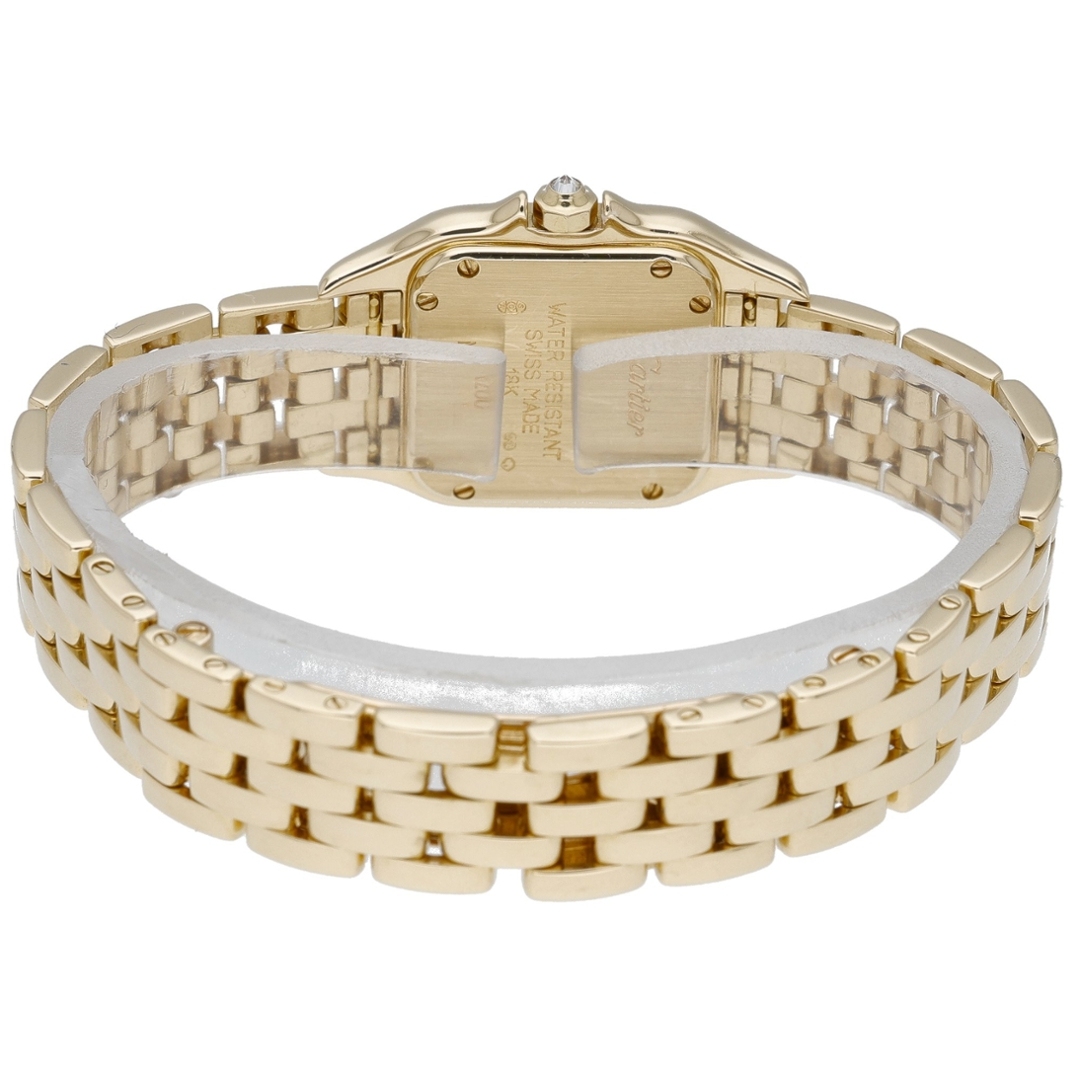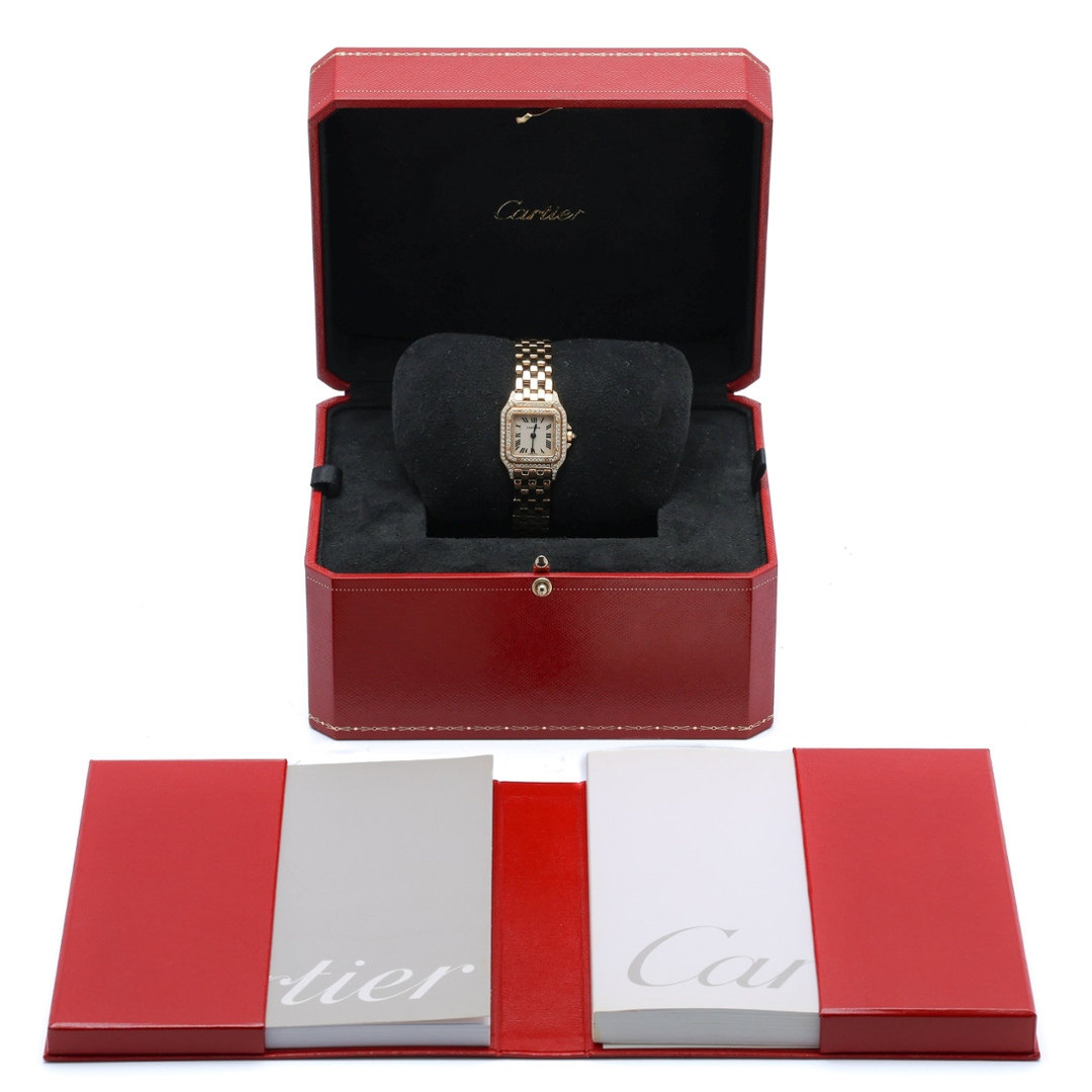 A Cartier Panthère watch crafted entirely from solid 18ct yellow gold, featuring an elegant white dial and a dazzling afterset diamond bezel that adds a touch of brilliance to this iconic design. Model number 1280, this 2001 example is powered by a precise automatic movement, combining Cartier’s timeless aesthetic with dependable performance. The 22mm case embodies the refined proportions and graceful curves that define the Panthère collection—one of the most enduring symbols of luxury and sophistication in Cartier’s history.