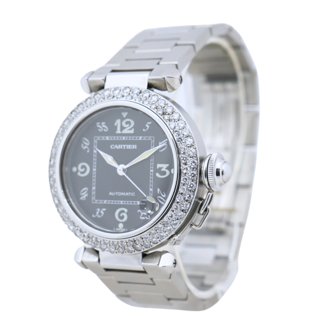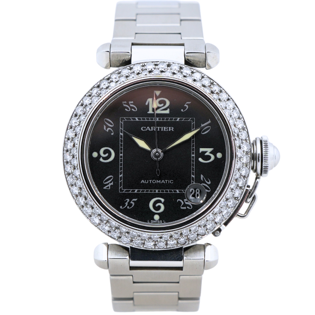 A Cartier Pasha C Watch, Stainless Steel with an Afterset Diamond Bezel on a Black Dial