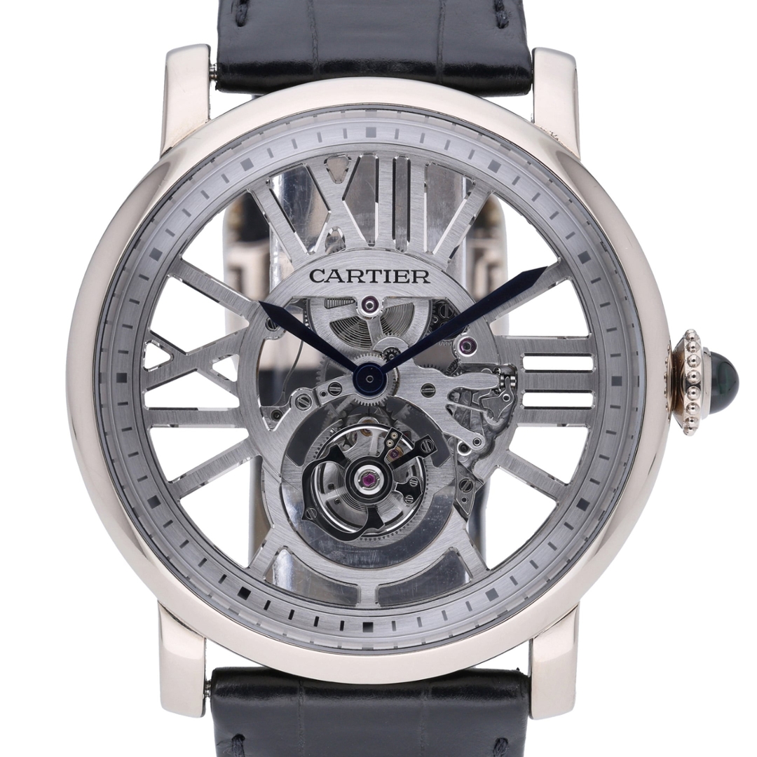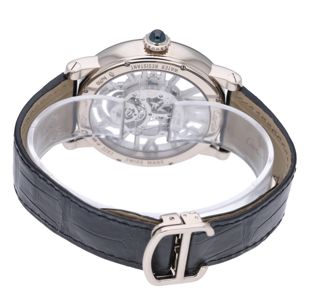 A Cartier Rotonde reference 3283 presented on a black leather strap with an 18ct white gold case and matching clasp, showcasing the maison’s refined approach to contemporary skeletonisation. The openworked dial reveals the intricate architecture of the movement, framed by stylised Roman numerals and a subtle minute track, while blued steel hands provide a striking contrast against the mechanical depth beneath.