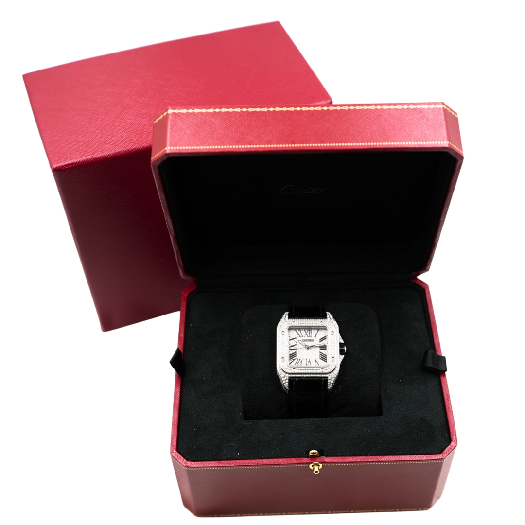 A Cartier Santos 100 2878 pairs timeless design with a dazzling modern upgrade. The stainless steel case, bezel, clasp, and dial are all meticulously set with brilliant afterset diamonds, creating an unforgettable presence on the wrist. Roman numeral hour markers and Cartier’s signature square design keep the classic Santos DNA intact, while the black leather strap adds an elegant contrast to the diamond brilliance.