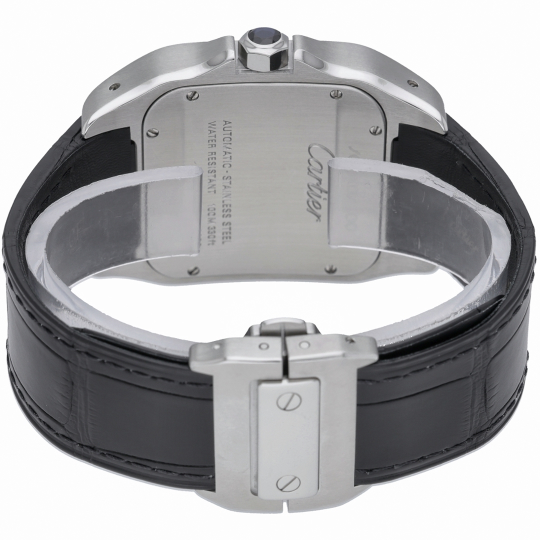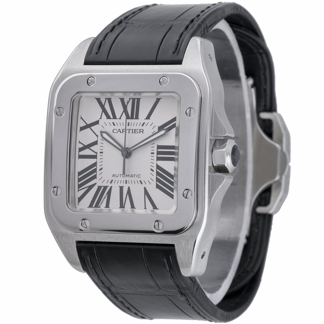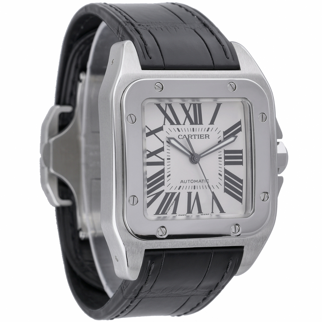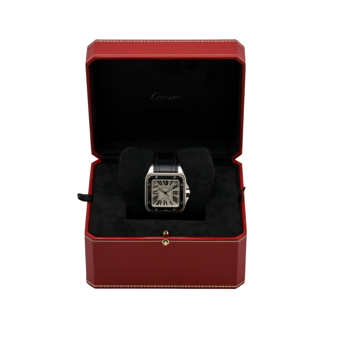 A Cartier Santos 100, presented on a black leather strap and housed in a stainless steel case, showcases one of the most iconic square watch designs in modern horology. The silvered-white dial is defined by bold black Roman numerals, a chemin de fer minute track, and classic blued-steel sword hands, delivering unmistakable Cartier styling. The signature exposed screws on the bezel and the integrated case design reinforce the Santos identity, offering a refined yet instantly recognisable presence on the wrist.