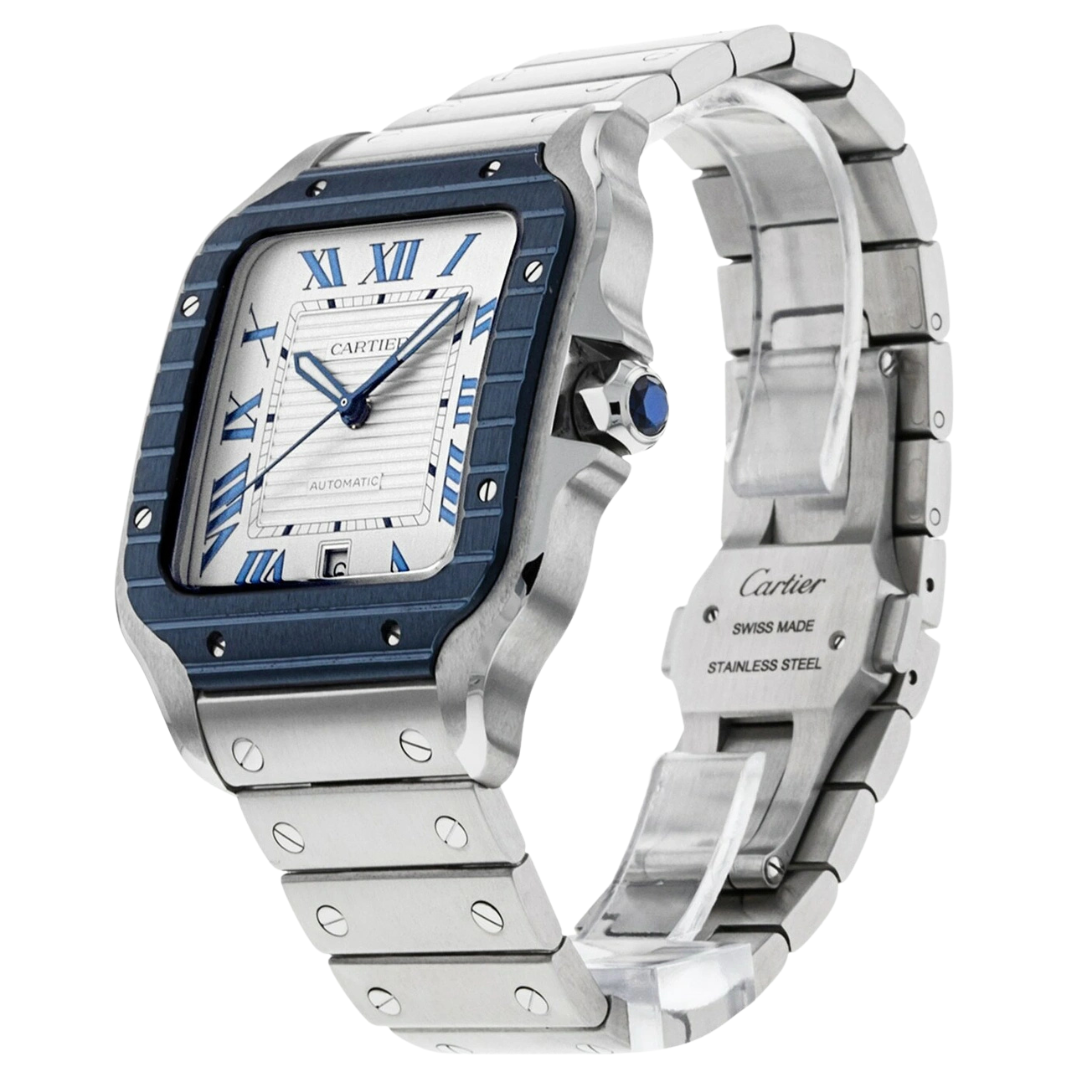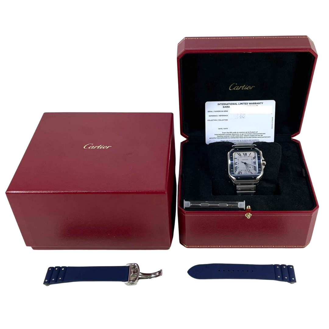 A Cartier Santos de Cartier, reference WSSA0047, presented in immaculate condition and offered as a complete, investment-worthy set. Crafted in stainless steel with the distinctive blue bezel, this 39mm model features the classic silvered white dial with blue Roman numerals and sword hands, powered by a reliable automatic movement. Supplied with the integrated steel bracelet and the original interchangeable blue rubber strap, it delivers both versatility and everyday wearability.