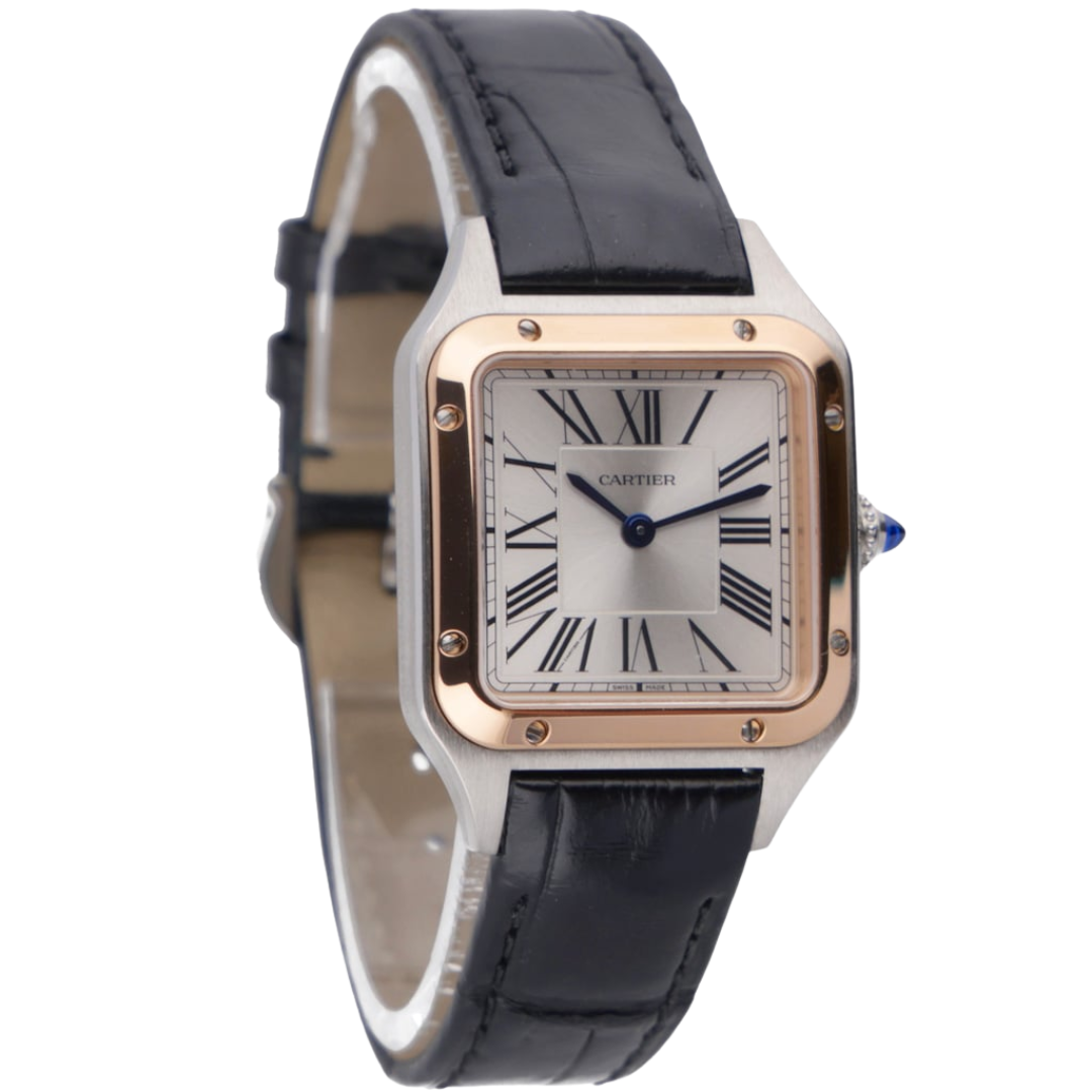 A Cartier Santos-Dumont watch in stainless steel and 18ct rose gold, featuring the brand’s instantly recognisable square case and an elegant silver dial with classic black Roman numerals. Blued steel hands and the signature blue cabochon crown complete the refined aesthetic, paired with a black leather strap for a timeless, dress-focused finish.