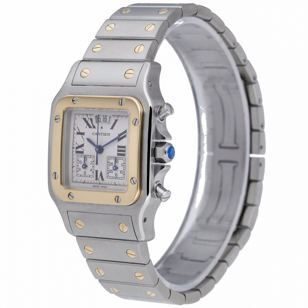 A Bi-Metal Cartier Santos Galbée Chronograph, model 2425, beautifully combines refined Parisian elegance with mechanical precision. Crafted from stainless steel and 18ct yellow gold, this sophisticated timepiece features the signature square case with exposed screws and a contrasting yellow gold bezel that frames the crisp white dial. The dial is adorned with black Roman numerals, blued-steel hands, and two sub-dials positioned at three and nine o’clock, capturing Cartier’s perfect balance between form and function.