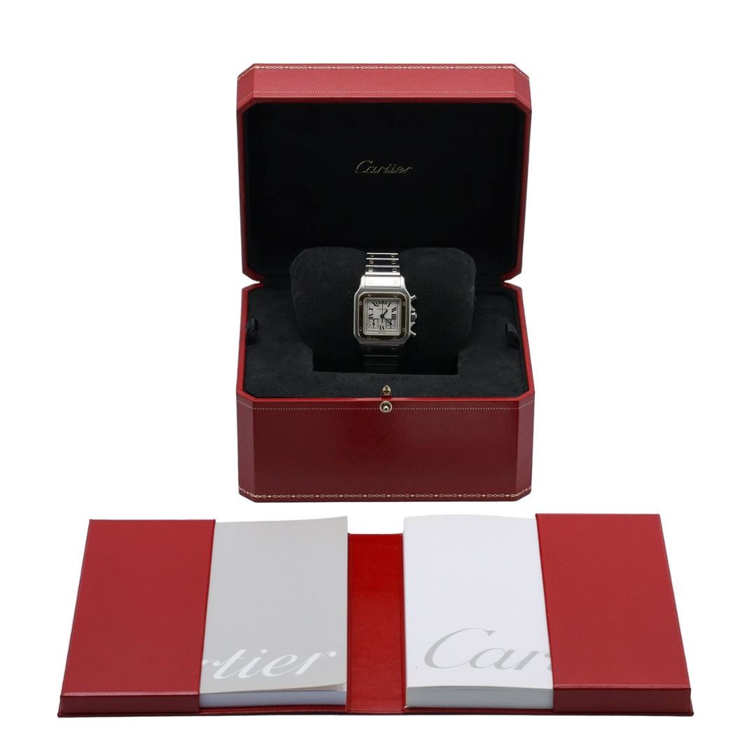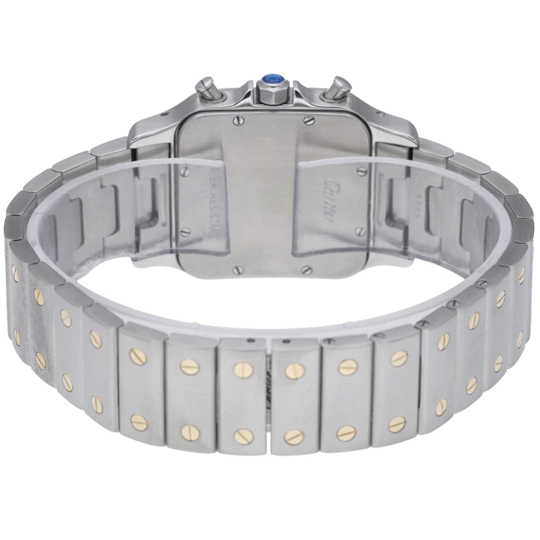 Powered by an automatic chronograph movement, this model delivers accuracy and performance with understated luxury. The bracelet, crafted from stainless steel with 18ct yellow gold screws, seamlessly integrates with the case—a hallmark of the Santos design that enhances both comfort and visual continuity. The crown, set with Cartier’s signature blue cabochon, adds a final touch of distinction to this timeless classic.