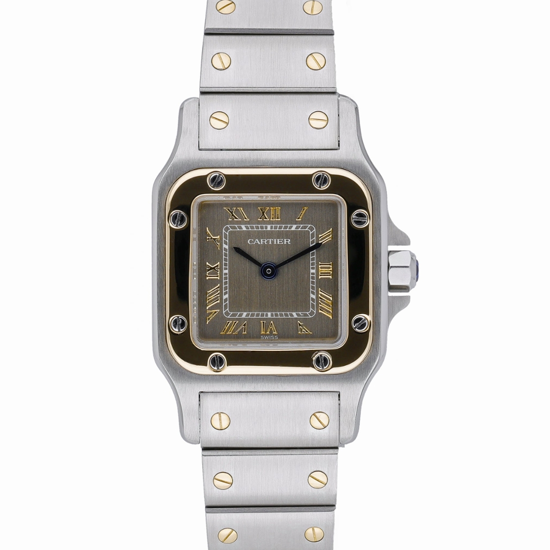 A Cartier Santos Galbée, presented in a refined bi-metal combination of stainless steel and 18ct yellow gold, showcases a distinctive variation of this iconic design. The 24mm case is paired with the signature integrated bracelet, featuring gold screws set against brushed steel links for a balanced and recognisable aesthetic. The grey dial adds a unique and understated tone, complemented by gold Roman numerals, a chemin de fer minute track, and blued steel hands for a subtle yet striking contrast.