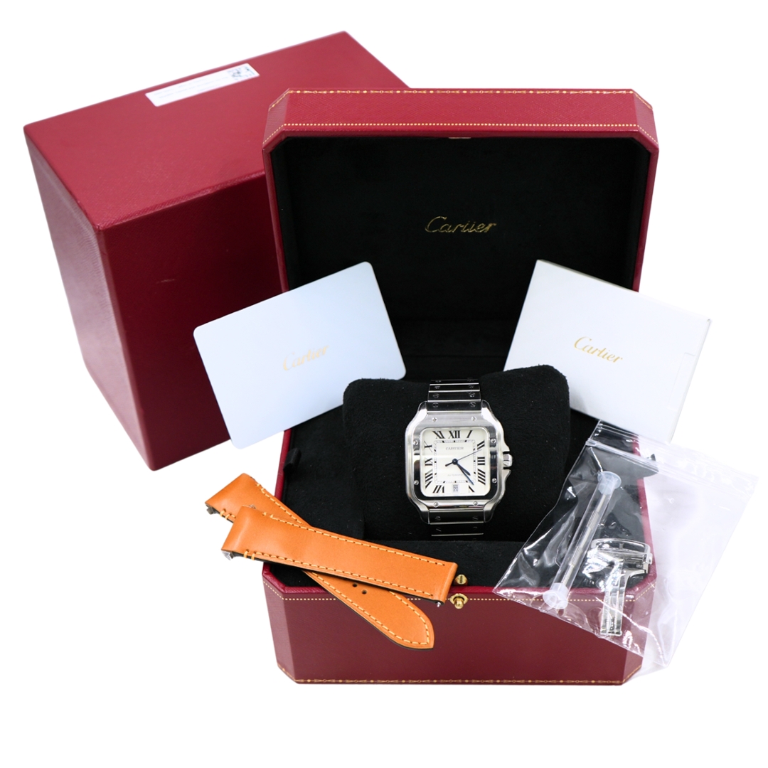 A Cartier Santos Large Watch, Stainless Steel with a White Dial.