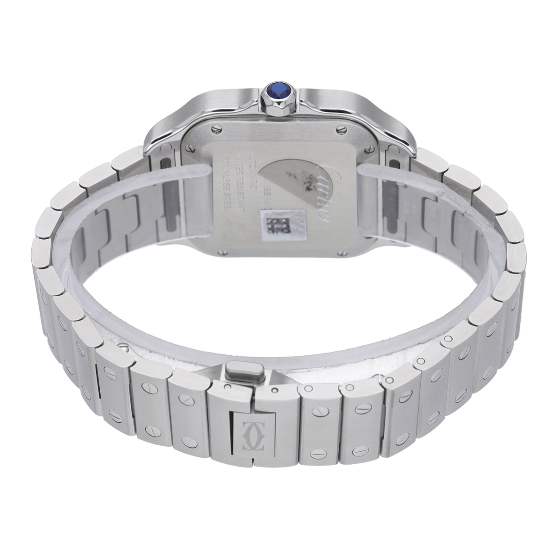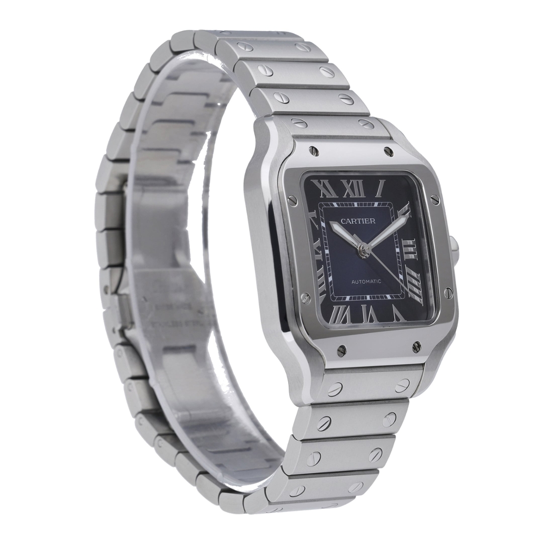 A Cartier Santos de Cartier Medium reference WSSA0063 features an iconic stainless steel square case, paired with a rich blue sunray dial that highlights Cartier’s signature Roman numerals and sword-shaped hands. The integrated bracelet and exposed bezel screws reinforce the model’s architectural identity, while the blue cabochon crown adds a refined finishing touch. At 35mm, this version offers balanced proportions that sit comfortably on the wrist without sacrificing presence.