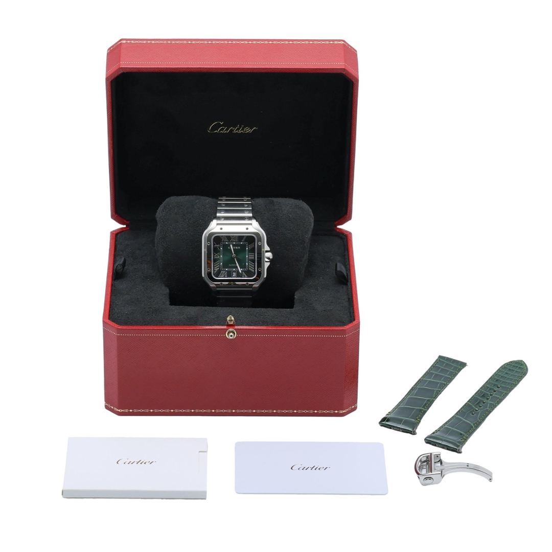 A Cartier Santos Watch, Stainless Steel on a Green Dial