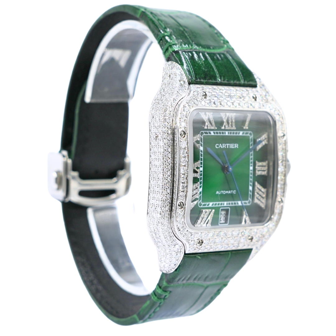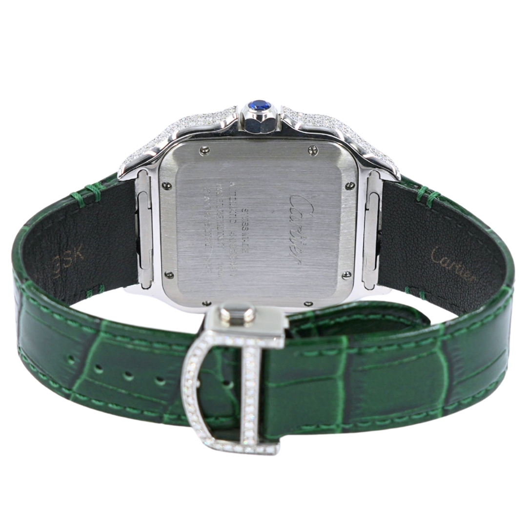 A Cartier Santos Watch, Green Leather Strap with an Afterset Diamond case and dial.