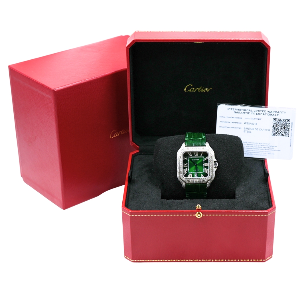 A Cartier Santos, reference WSSA0018, offers a contemporary and highly eye-catching take on one of Cartier’s most recognisable designs. Produced in 2025, the 40mm stainless steel case is complemented by an afterset diamond-set bezel, case, and clasp, paired with a deep green afterset dial finished with diamond Roman numerals. The result is a strong visual statement that remains instantly identifiable as a Santos.
