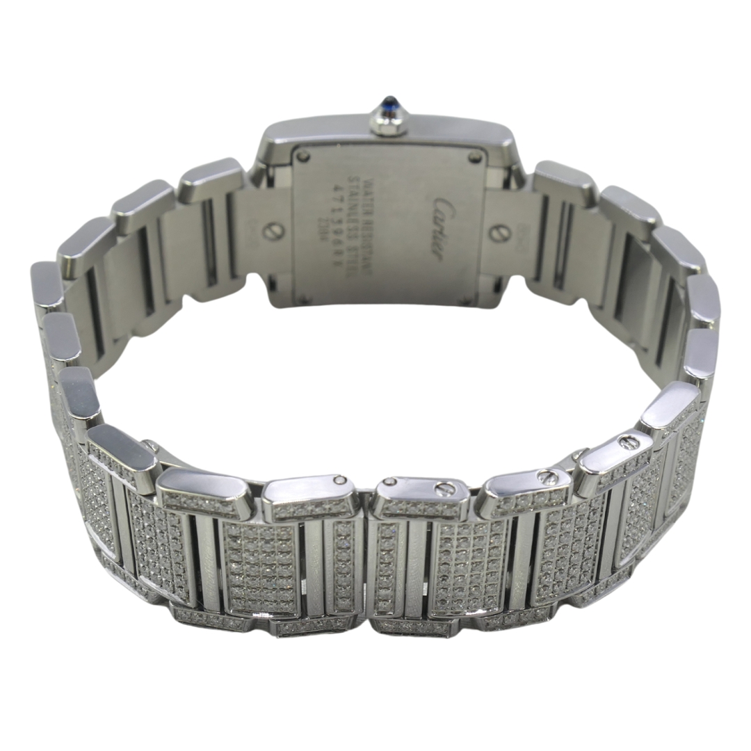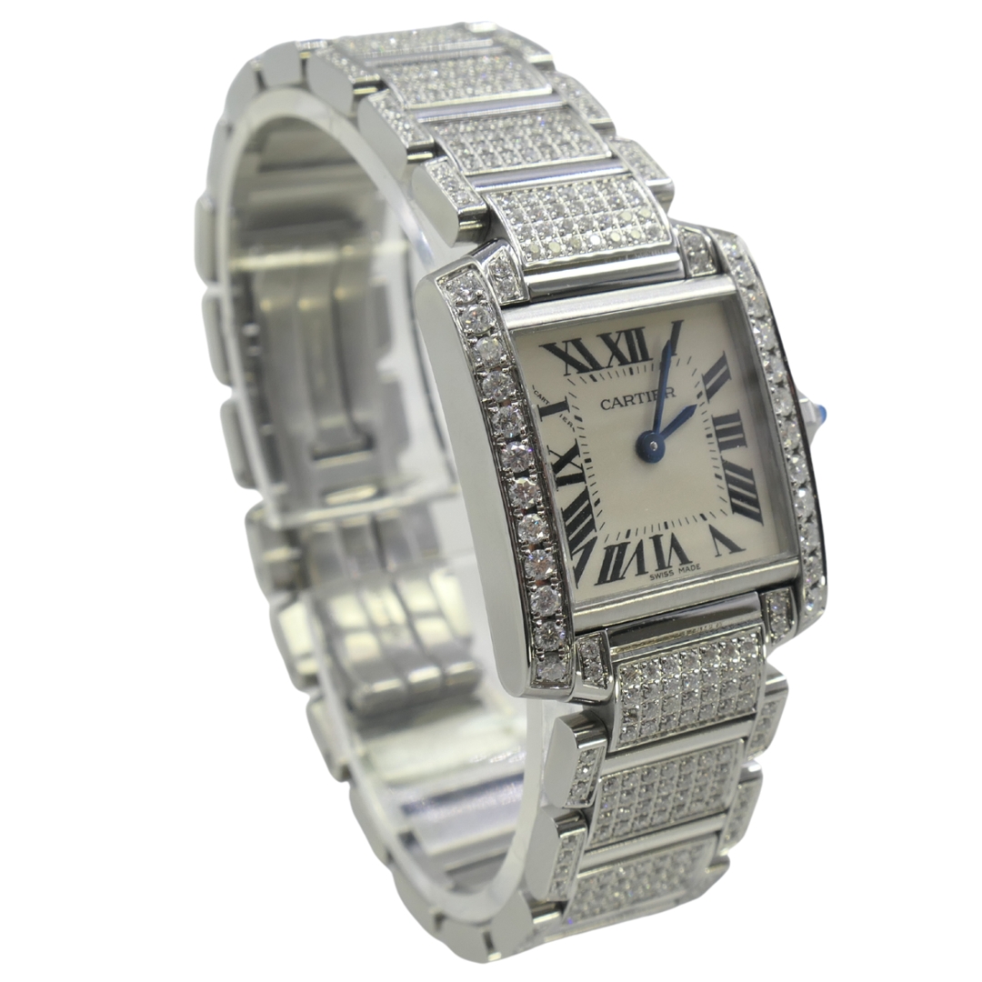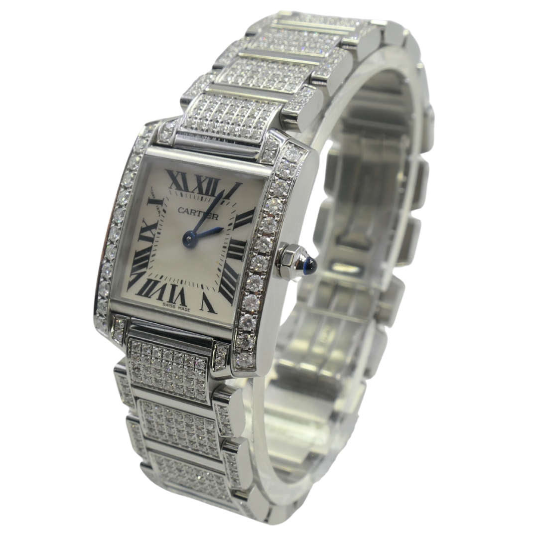 A Cartier Tank Francaise Watch, Full Afterset Diamond Bracelet and Bezel on a White Dial.