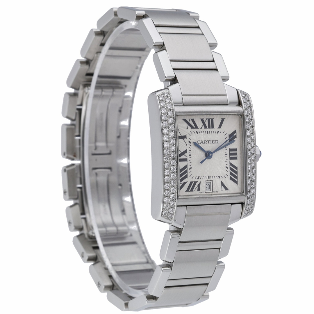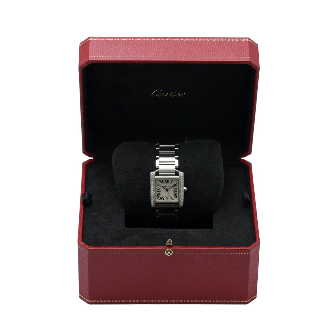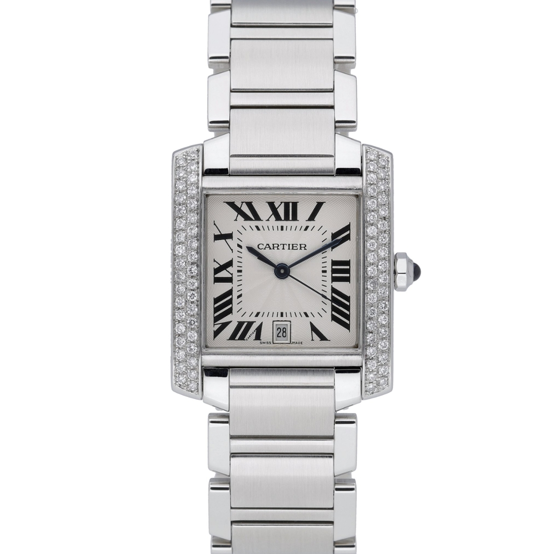 A Cartier Tank Francaise Watch, Stainless Steel with a Diamond Bezel on a White Dial