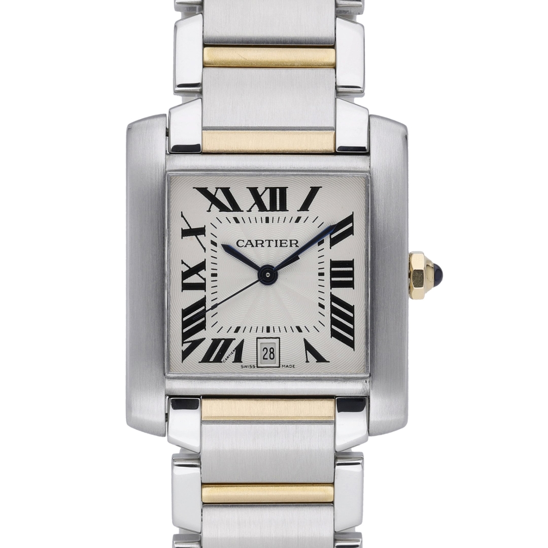 A bi-metal Cartier Tank Française 2302, this 28mm stainless-steel and yellow-gold example offers the unmistakable elegance that has made the Tank line one of the most enduring designs in watchmaking. The stainless-steel case frames a crisp white dial with bold Roman numerals and blued steel hands, creating the classic Cartier aesthetic collectors continue to value. Its two-tone bracelet adds subtle warmth without compromising the refined geometric profile of the Française design.