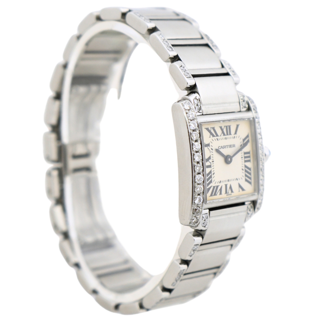 A Cartier Tank Francaise Watch, Afterset Diamond-Lined Bracelet and Bezel on a White Dial.