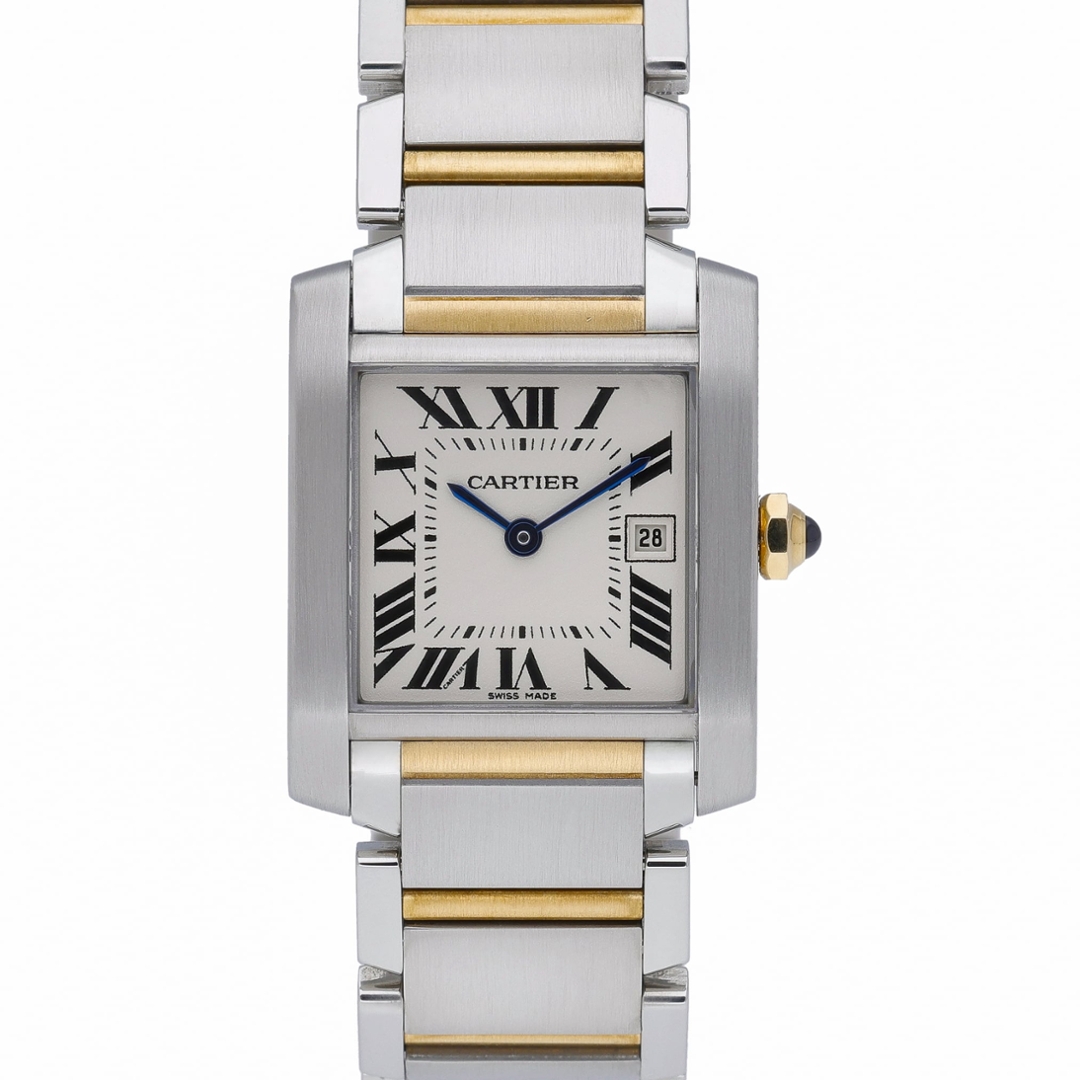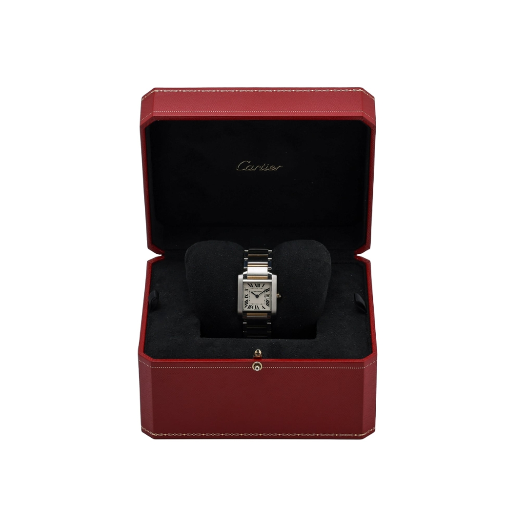 A Cartier Tank Française Watch in bi-metal stainless steel and 18ct yellow gold, reference 2465, presented in immaculate condition, showcasing one of Cartier’s most recognisable and versatile designs. The 25mm case is defined by its clean lines and integrated bracelet, combining brushed steel with gold accents for a refined yet contemporary aesthetic. The distinctive case profile and bracelet construction set the Tank Française apart within the Tank collection.